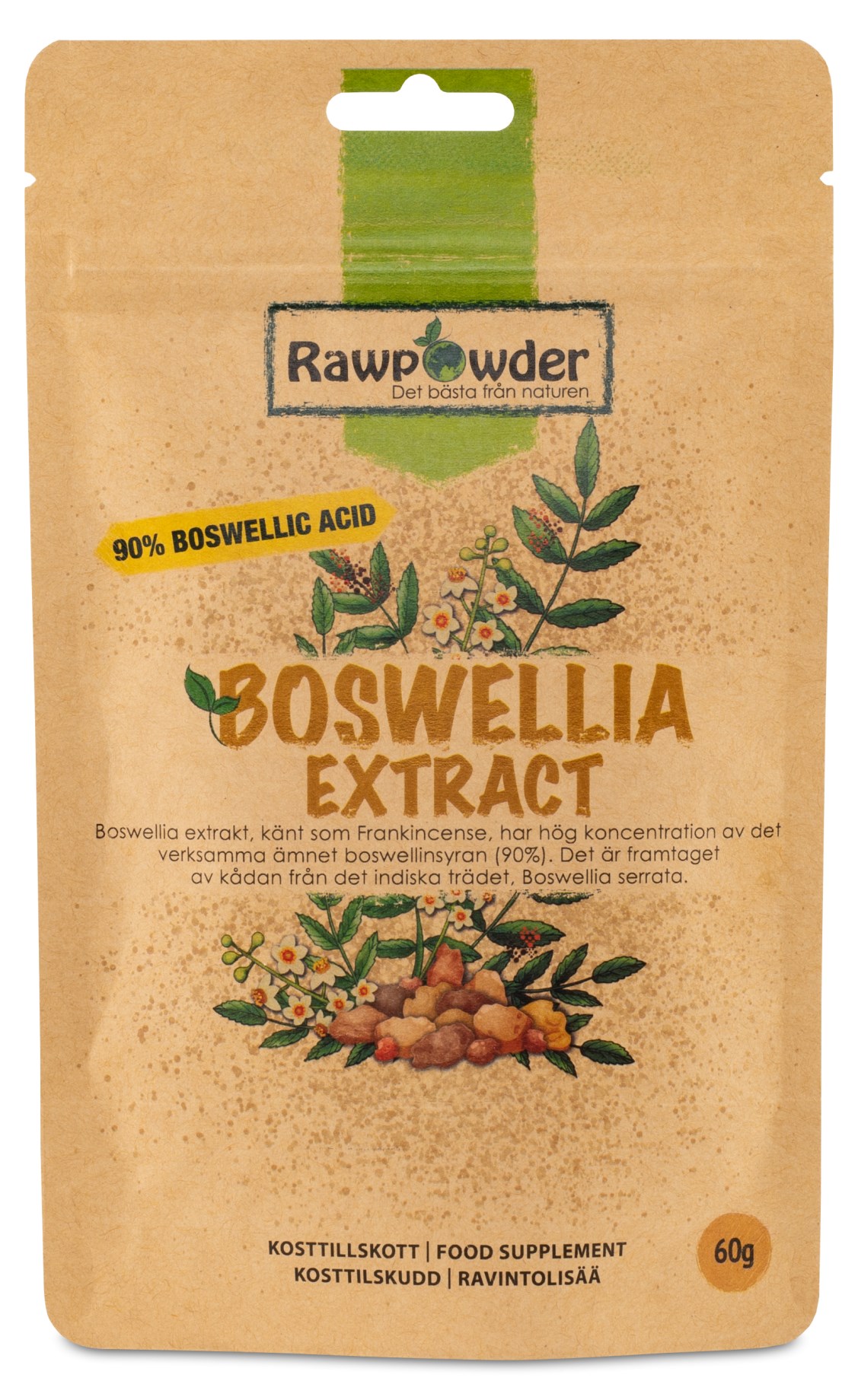 Rawpowder Boswellia extrakt kommer i pulverform som ett kosttillskott. Boswellia serrata är ett välkänt träd som växer både i Afrika och Asien. Det är känt som Frankincense och framtaget av kådan från det indiska boswellia trädet. Det har länge använts av hinduer inom ayurveda som hjälp vid olika inflammationer. Extraktet har hög koncentration av det verksamma ämnet boswellinsyran, hela 90%. Du löser enkelt upp extraktet i vatten och du kan även blanda det i juice eller i en smoothie.