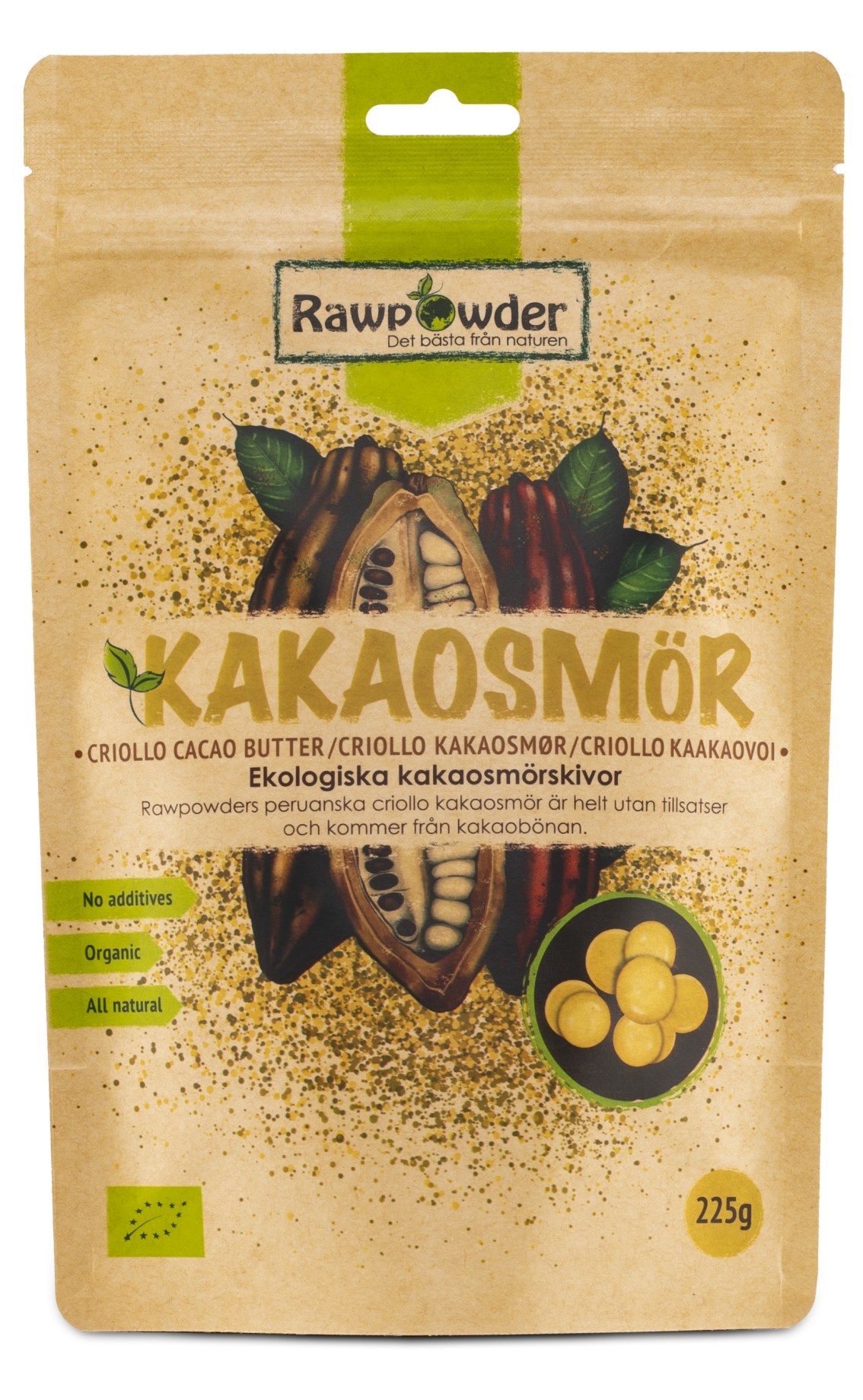Kakaosmör Skivor är ekologiskt, producerat från råa kakaobönor av sorten criollo. Kakaosmöret är portionerat i mindre skivor, vilket gör det enklare att använda till bakning och matlagning. Criollo är den kakaoböna som anses vara den finaste, dels på grund av dess raritet. Vid tillverkningen utvinns kakao och olja var för sig, där oljan får stelna till vitt smör. Kakaosmör har en mjuk chokladsmak och är gott att använda i bakning och matlagning, eller varför inte i en smoothie.