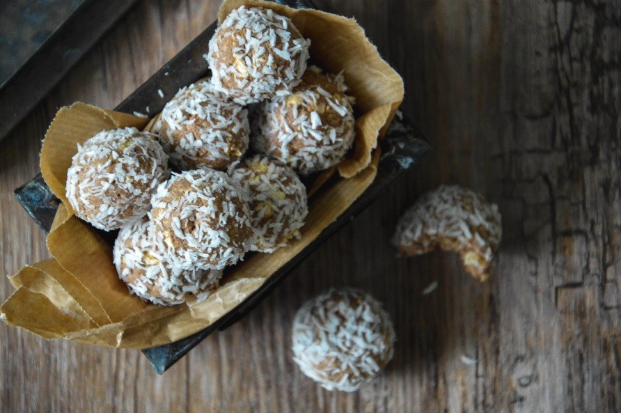 Blanda samman alla ingredienser utom den rivna kokosen. Forma smeten till små bollar och rulla dem i riven kokos. Klart att servera!
