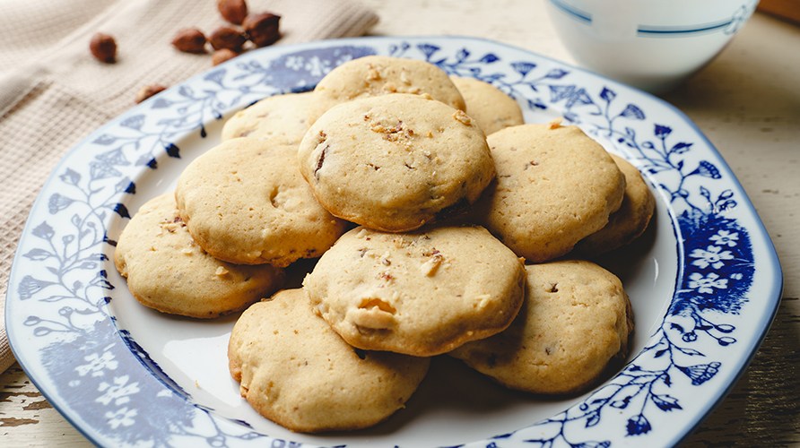 När detta är gjort blandar du ihop ägg med hasselnötter och övriga ingredienser. Klicka ut smeten i valfri storlek på en bakplåt då klätt med bakplåtspapper. Toppa med de grovhackade hasselnötterna du la undan. Sätt in plåten i mitten av ugnen på 175 grader i 12-14 minuter.