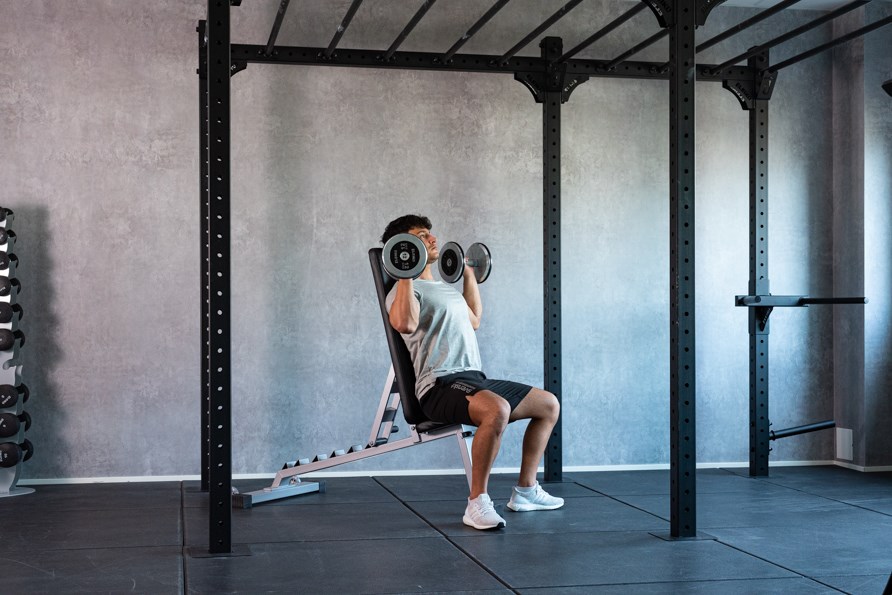 • Andas in i utgångsposition och andas ut när du pressar upp hantlarna.