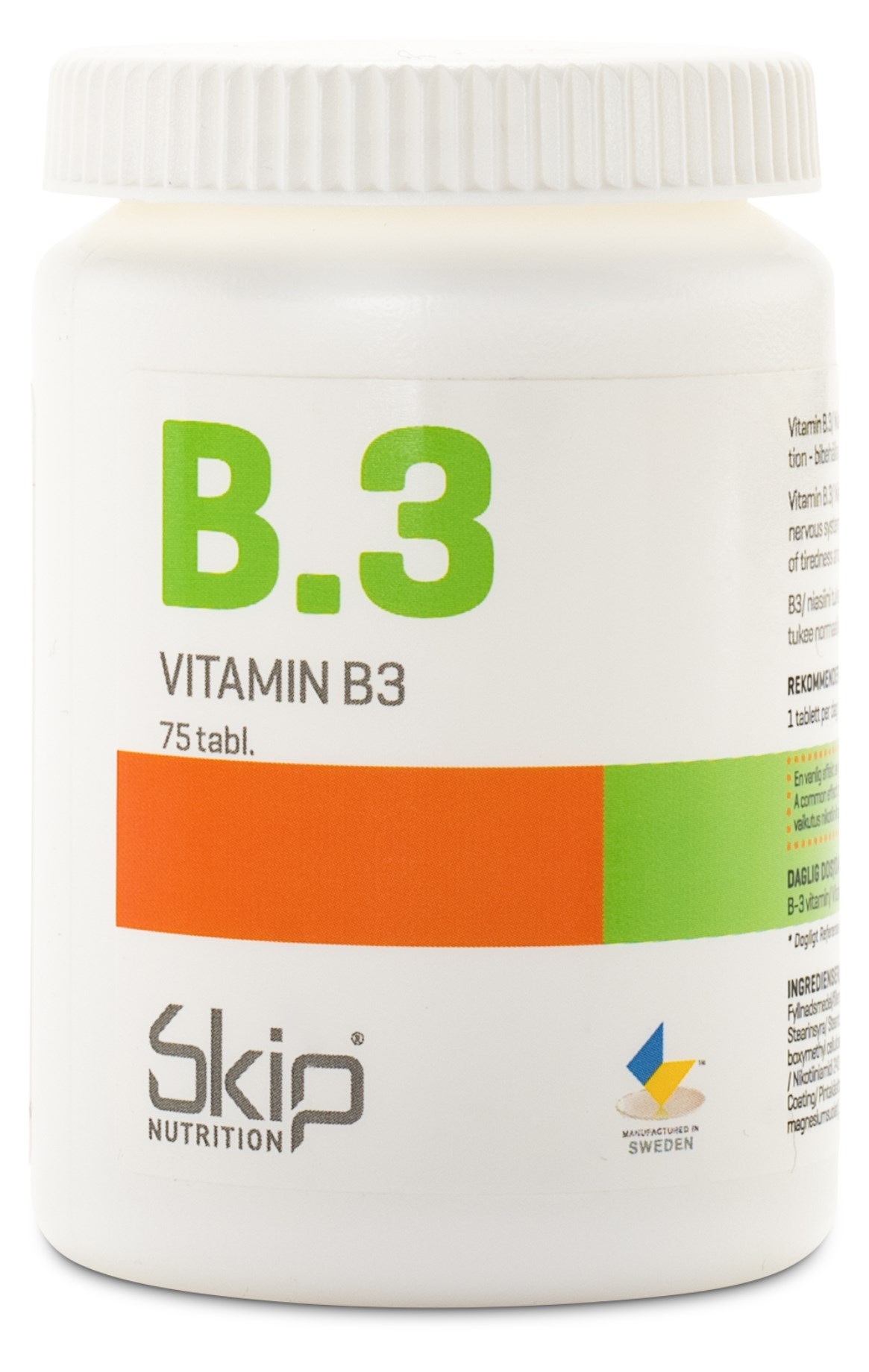 Bidra till kroppens energiproduktion och för cellernas omsättning av fett och kolhydrater med rätt näringsämnen. Skip Vitamin B.3 innehåller B3-vitamin, även kallat Niacin, som bidrar till kroppens energiproduktion, till ett normalt fungerande nervsystem, minskad trötthet och utmattning samt till underhållet av huden och slemhinnorna.