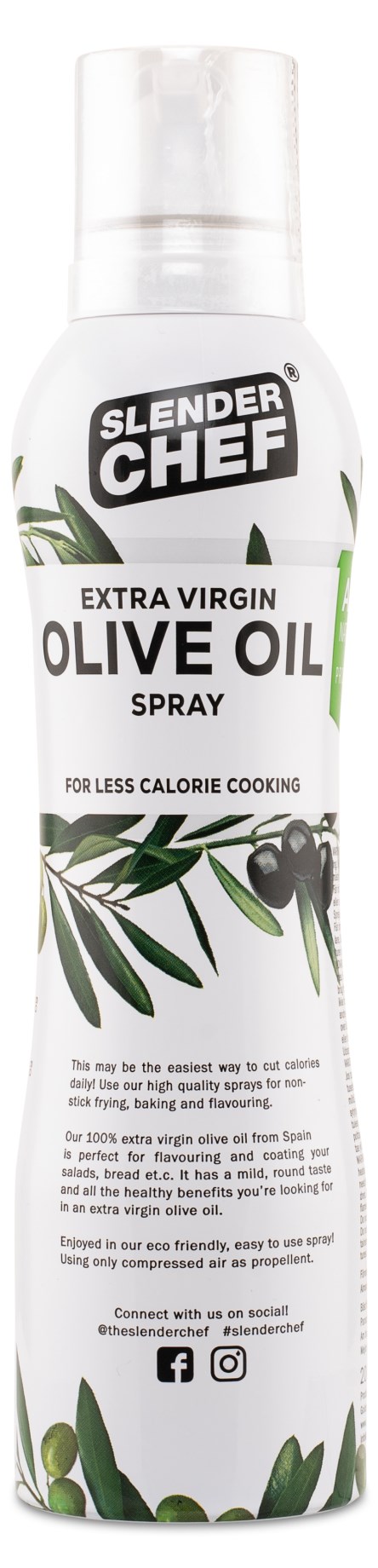 Slender Chef Extra Virgin Olive Oil Spray är en olivolja i en smidig sprayflaska som enkelt låter dig minimera användningen av fett i matlagningen. En sprayning ger endast 1 g fett. Fettet fördelas jämnt, även på större ytor, då förpackningen är trycksatt. Använd i stekpannan eller direkt på maten för god smak, exempelvis när du ska rosta potatis i ugnen.