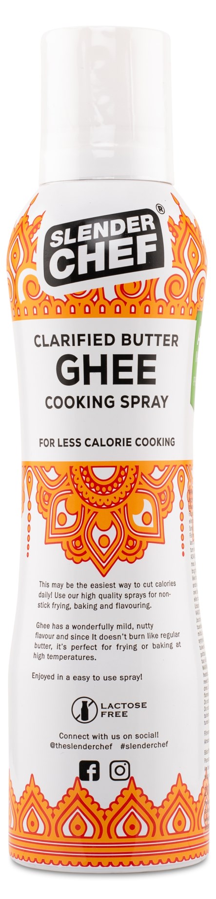 Slender Chef Ghee Cooking Spray är klarifierat smör i en smidig sprayflaska. Flaskan sprider en jämn yta med endast 1 g fett per spray. Slender Chef Ghee Cooking Spray hjälper dig att minimera mängden fett i maten och är smidig att använda under diet när du vill hålla nere kalorierna. Kan användas direkt i stekpannan eller på maten för att ge en god smörsmak.