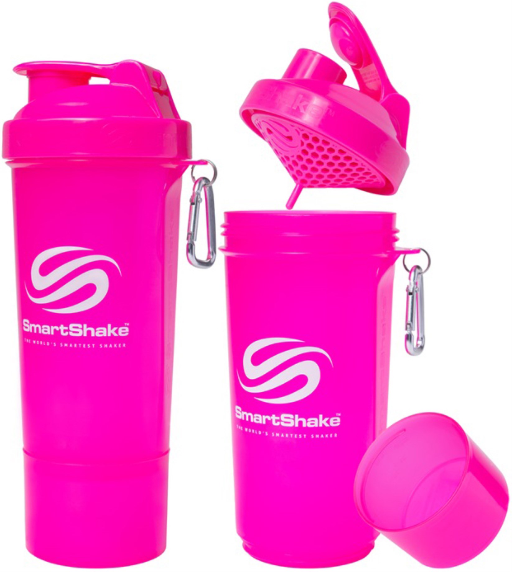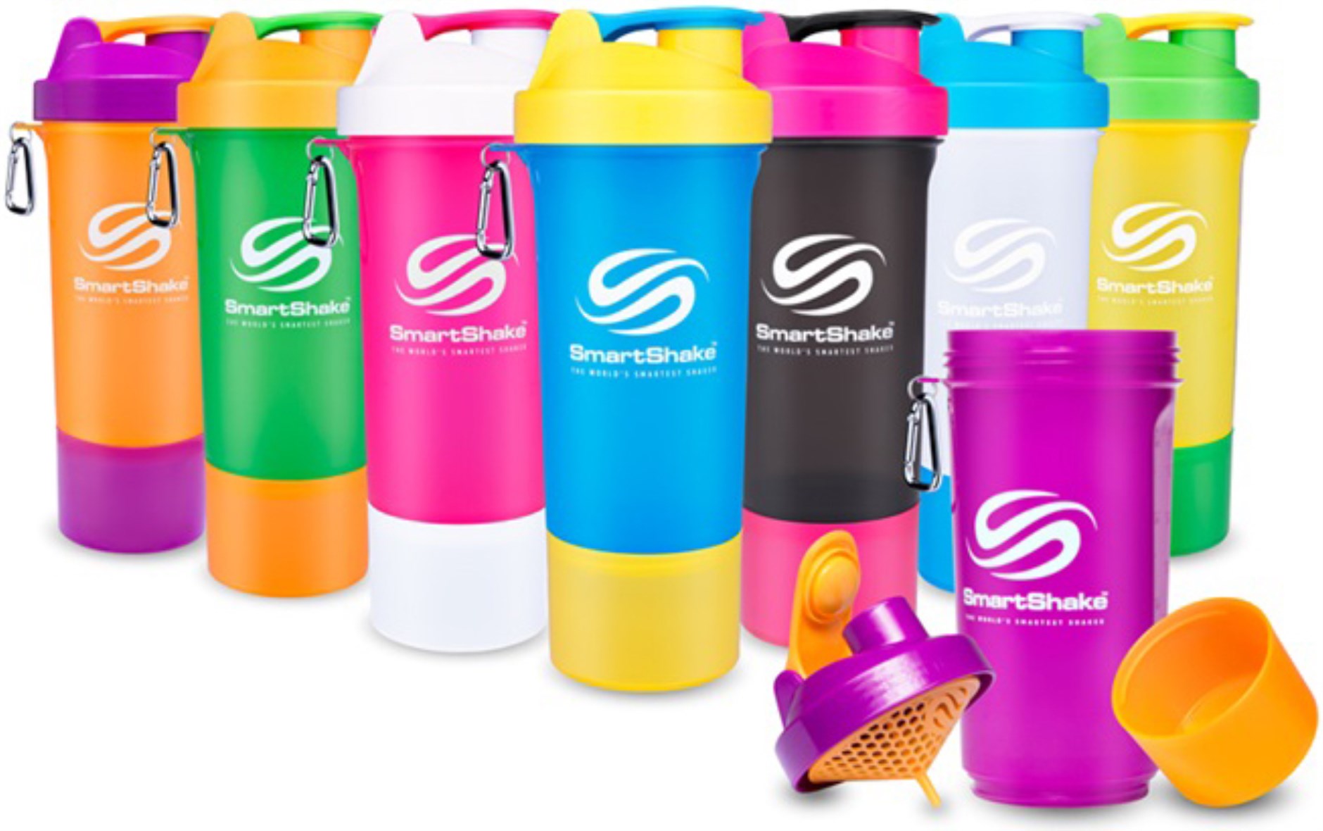 Med SmartShake har du fler möjligeter att ta med dig pulver och shakes i väskan. Själva shakern har plats för 400 ml och rymmer totalt 500 ml, med en behållare undertill där du kan förvara ytterligare pulver. SmartShake Slim är en smalare och smidigare variant av SmartShake, med smalt grepp. Blanda behållare, lock och blandkärl från flera olika smartshakes för att skapa den färgkombination du önskar och sätt en personlig prägel på den!