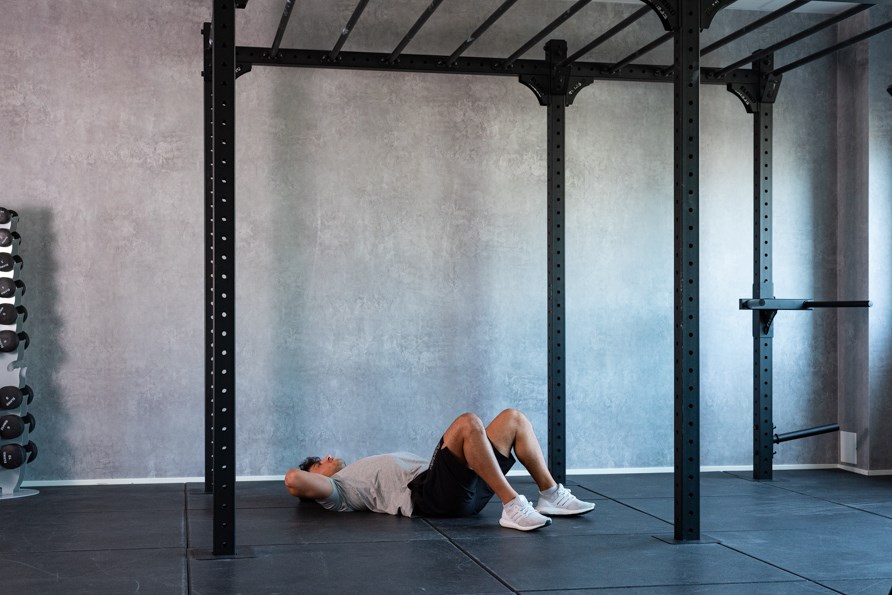 1. Lägg dig på rygg på golvet med knäna i en 90 graders vinkel.