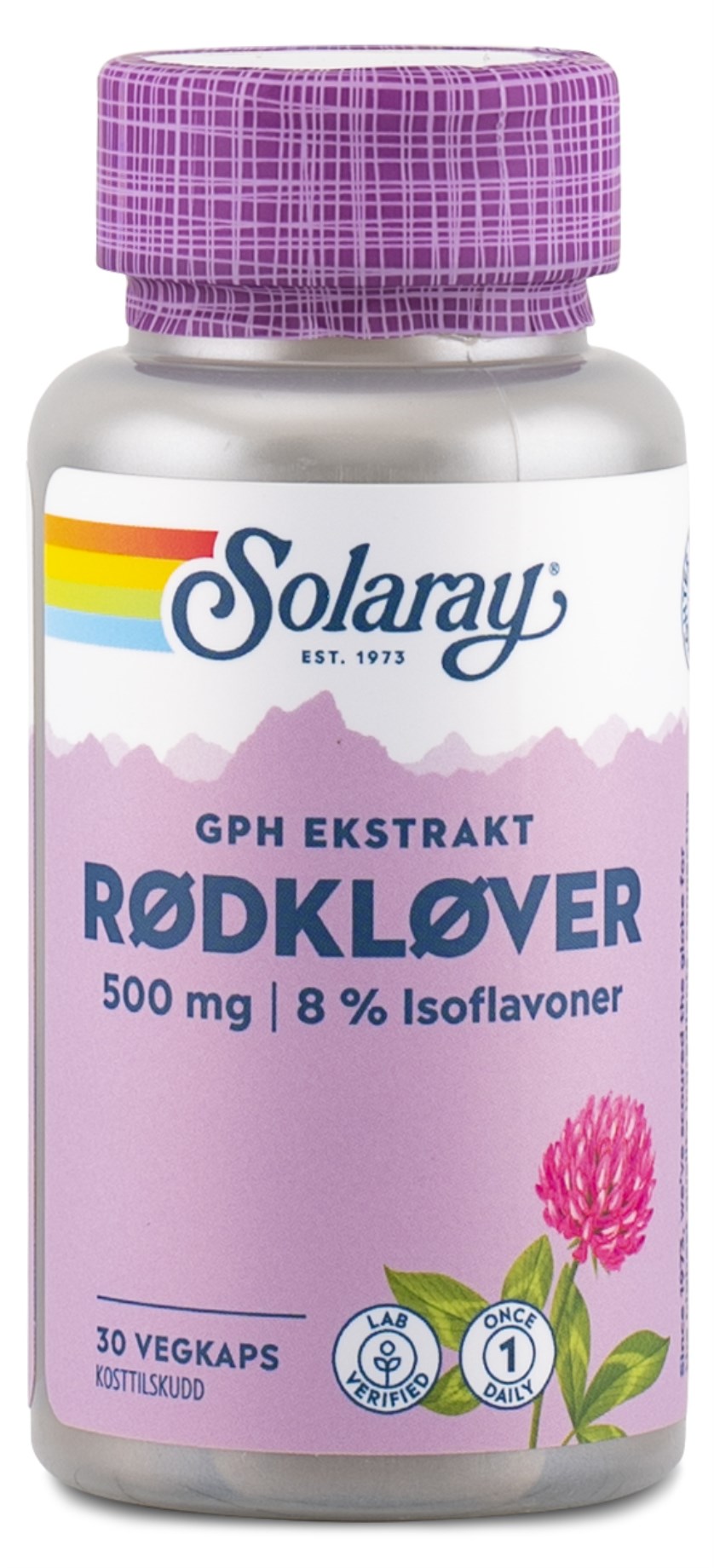 Solaray GPH Rödklöver är ett tillskott med rödklöverextrakt, en växt som växer i Europa, Centralasien och norra Afrika. Varje kapsel innehåller en standardiserad mängd isoflavoner, en typ av fytoöstrogen, från en naturlig källa.