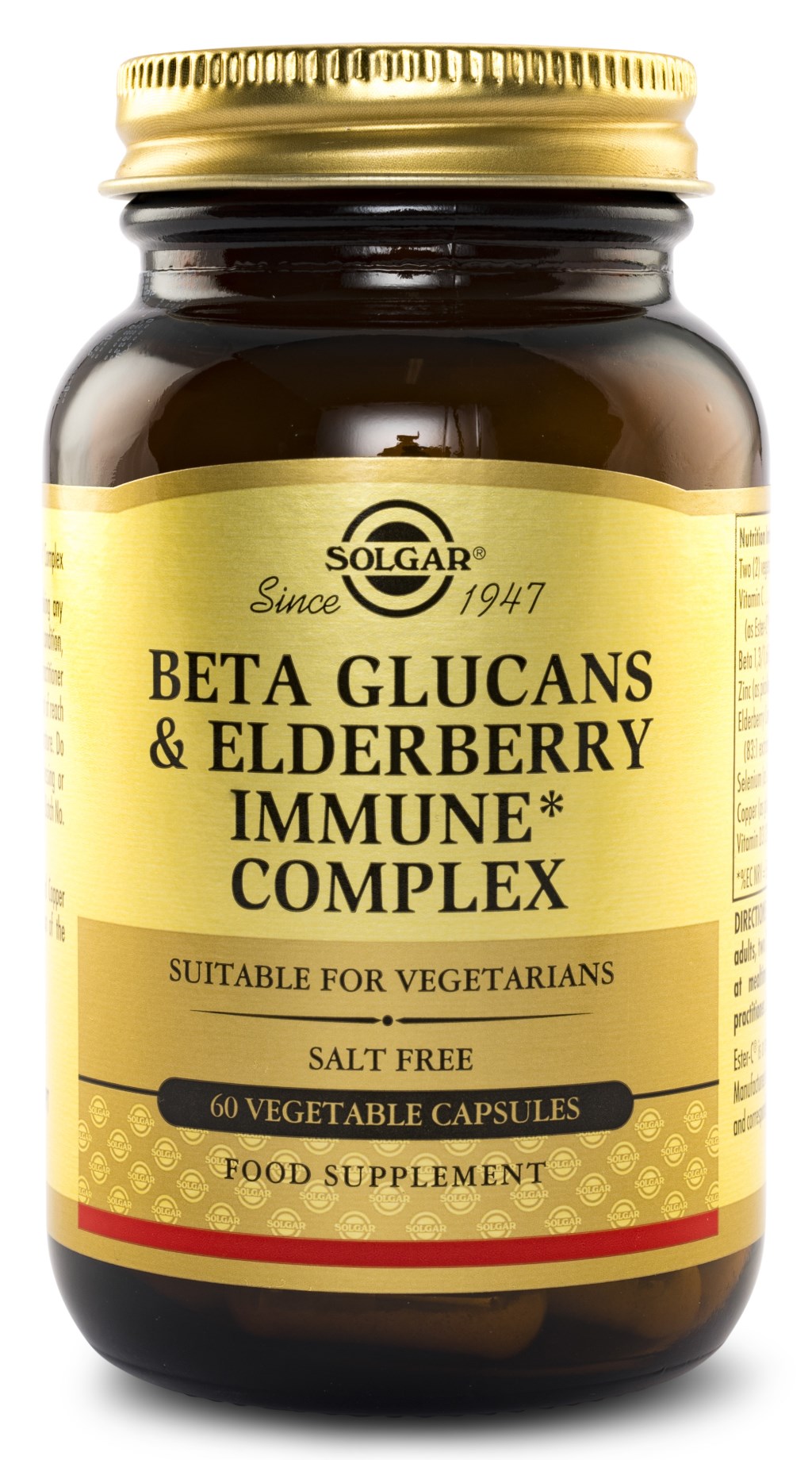 Solgar® Betaglukan & Fläder (Solgar® Beta glucan & Elderberry Immune Complex) är ett dagligt tillskott för dig som vill säkerställa ditt intag av dessa näringsämnen. Produkten innehåller enbart vegetabiliska ingredienser, med betaglukaner, fläderextrakt samt vitaminer och mineraler i kombination.