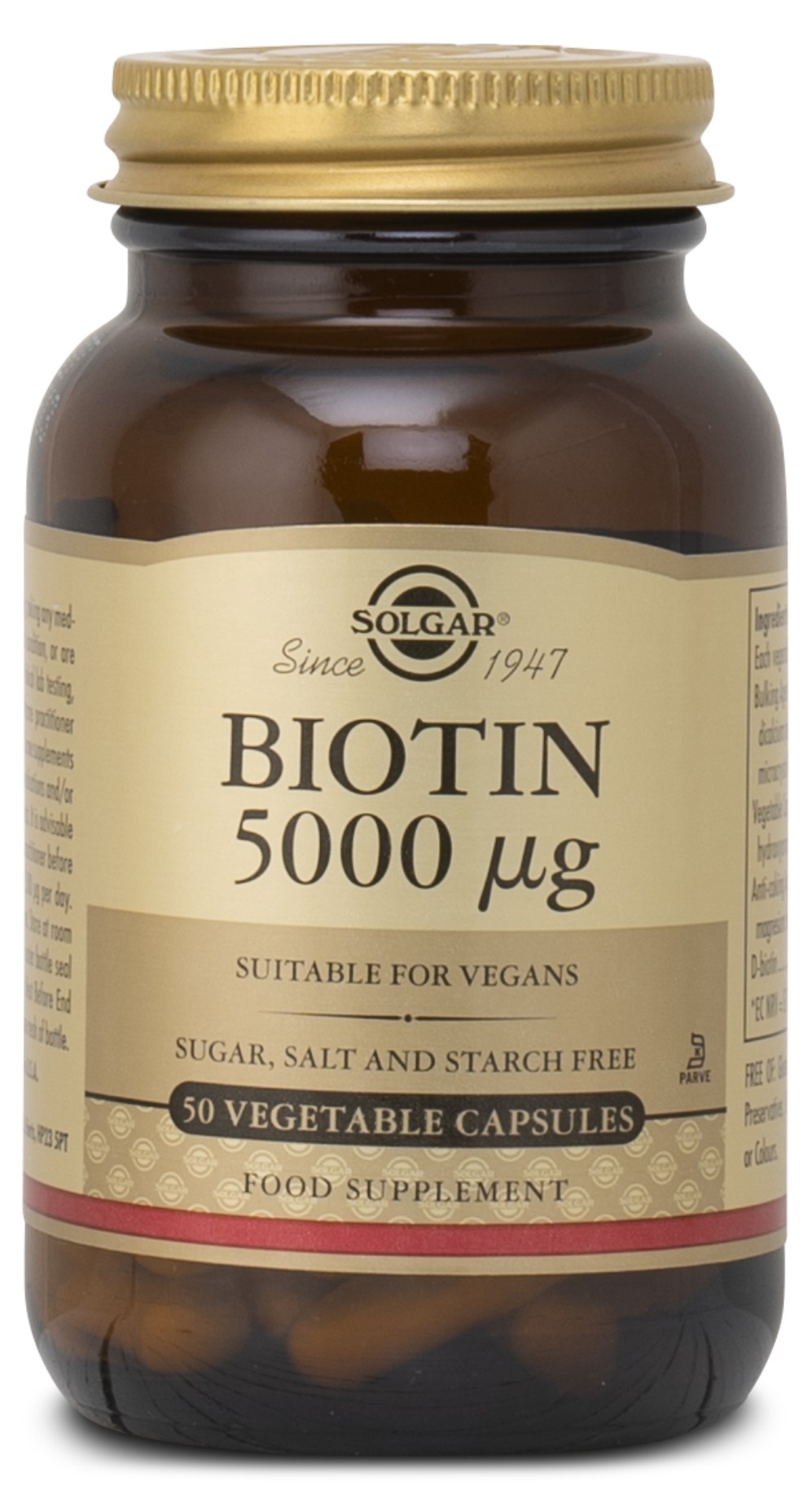 Solgar Biotin 5000 ug är ett högdoserat kosttillskott med vitamin B7. En kapsel om dagen ger dig 5000 mikrogram vegetabiliskt biotin. Biotin är ett vattenlösligt vitamin som hjälper huden och hårets enzymer att fungera optimalt vilket hjälper till att bibehålla ett friskt hår och en normal hud. Vitaminet underlättar även för kroppens energiomsättning. Kapslarna från Solgar är vegetabiliska och fria från gluten och jäst.