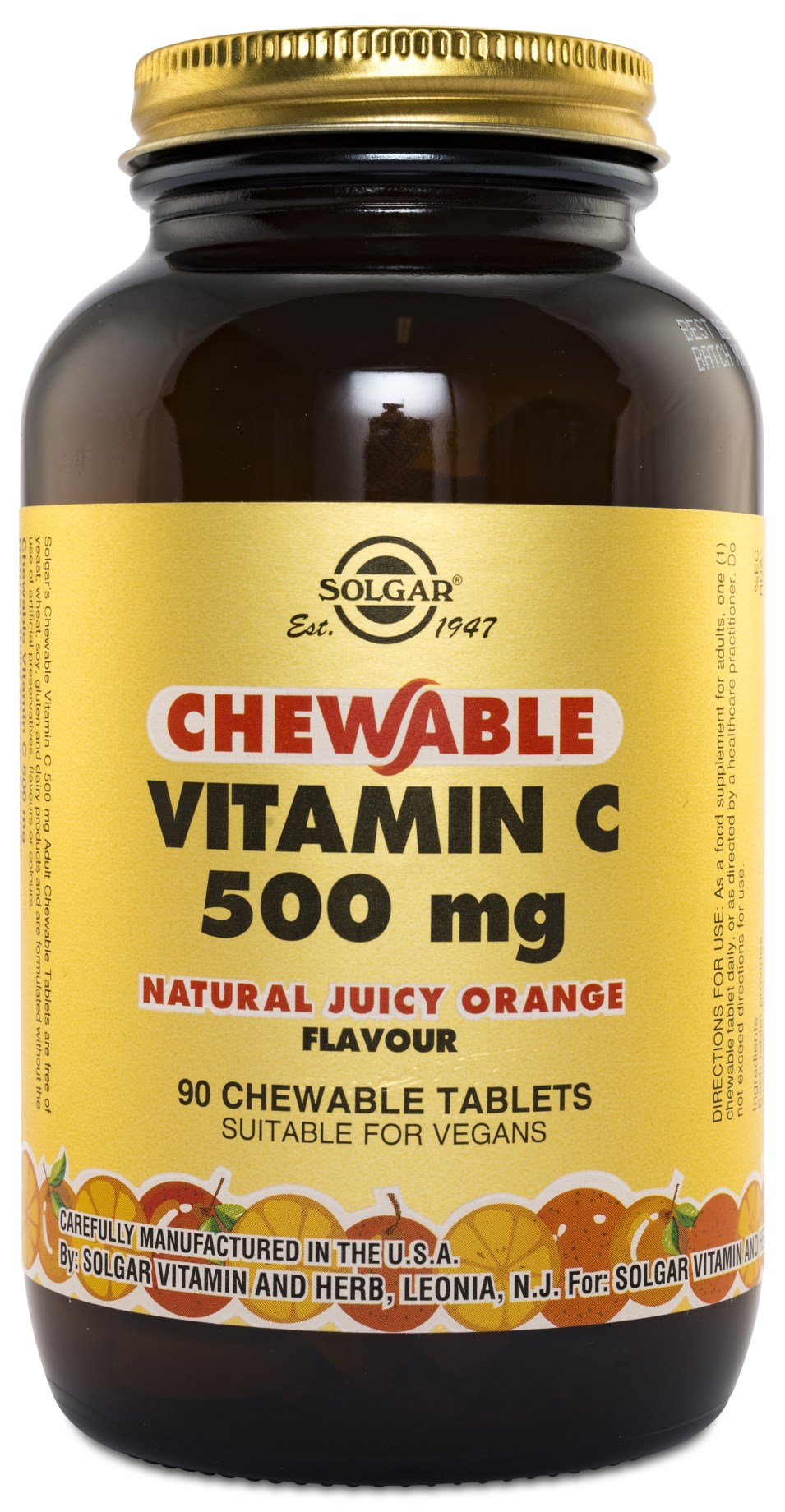 Solgar Chewable Vitamin C innehåller 500 milligram C-vitamin per tablett, från C-vitaminkällor av hög kvalité som är lätt för kroppen att tillgodogöra sig. Solgars C-vitamin innehåller även naturliga fruktextrakt från acerola och nypon. Solgars C-vitamin kommer i praktiska och goda tuggtabletter, rekommenderad dosering är en till två tabletter per dag.