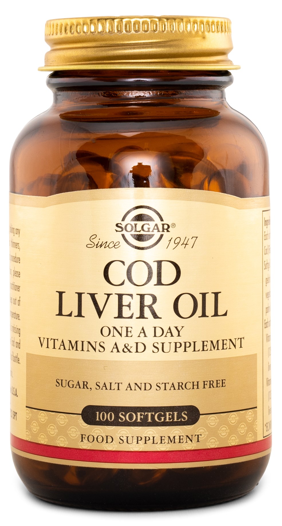 Solgar Cod Liver Oil innehåller 462 mg torskleverolja per kapsel och tillför flera viktiga fettsyror till kroppen. Solgar Cod Liver Oil framställs från fisk som lever i djupa, kalla hav vilket anses höja kvaliteten på fiskoljan. Fiskleverolja är typiskt rik på bland annat omega-3-fetter, men innehåller också vitamin A och D. Omega-3 bidrar till en normal hjärt- och kärlhälsa och till normal cellbildning, medan vitamin A bidrar till normal syn och normala slemhinnor. Vitamin D bidrar bland annat till ett normalt fungerande immunsystem. Både vitamin A och vitamin D är fettlösliga vitaminer vilket gör att de gynnas av att intas i samband med en liten mängd fett från en måltid.