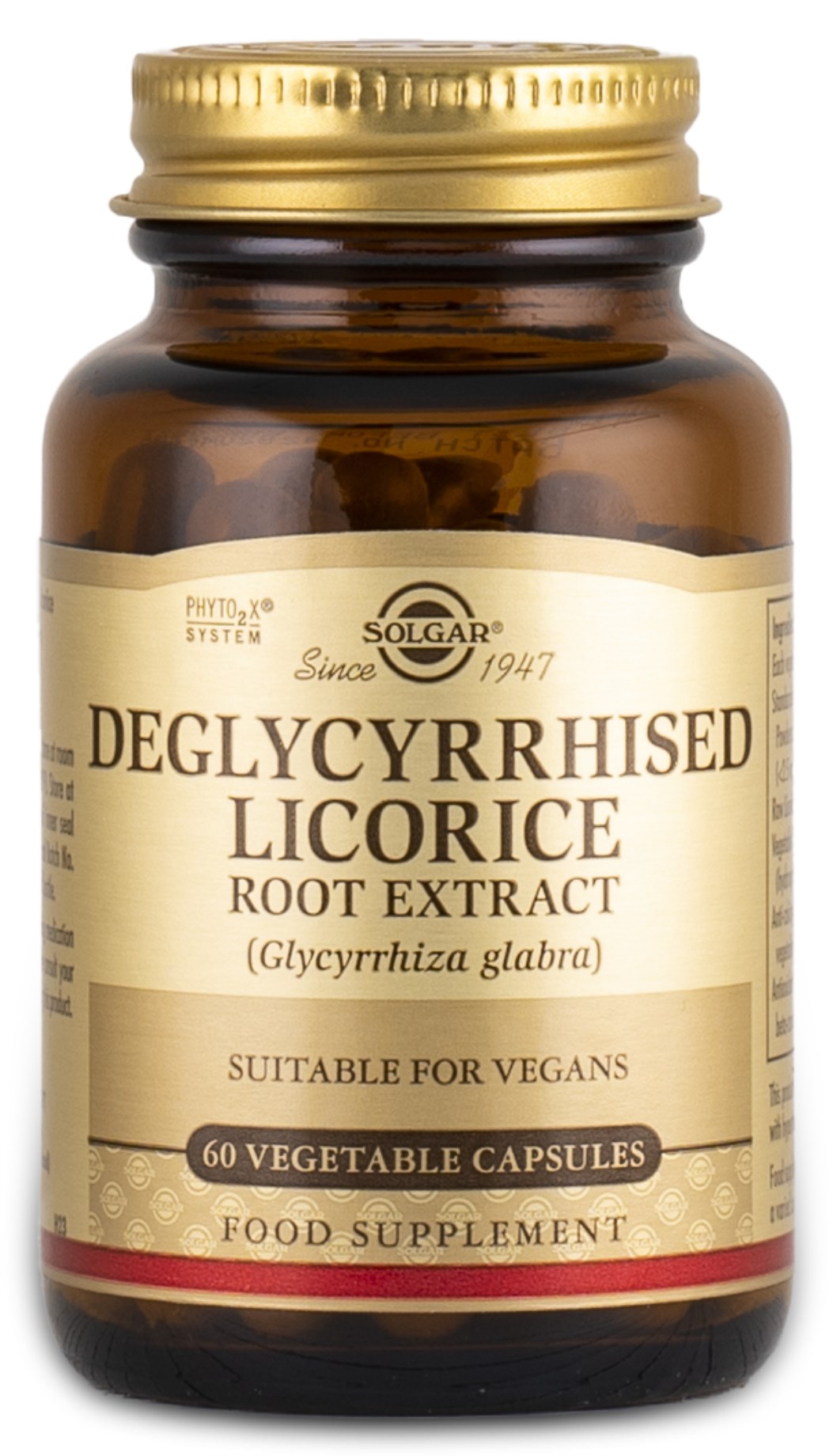 Kapslar med extrakt från lakritsroten. Solgars lakritsrotextrakt är utan glycyrrhizin, det ämne i lakrits som ger det dess söta smak och som kan påverka blodtrycket hos oss människor. Att Solgars lakritsrotkapslar är fria från detta ämne gör att de kan användas under lång tid utan att påverka blodtrycket. Lakritsroten har länge använts för en rad olika hälsoeffekter, bland annat har den använts som lugnande medel och som tillskott vid magproblem.