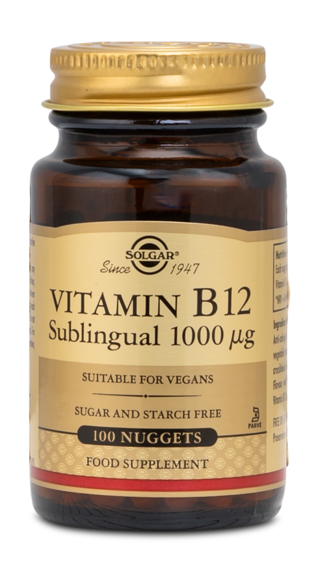 Vitamin B12 (kobalamin) bidrar till normal bildning av röda blodkroppar och till nervsystemets normala funktion. Det bidrar i sin tur till en minskad trötthet och utmattning. Vitamin B12 förekommer nästan enbart i animaliska livsmedel, så att personer med strikt vegetarisk kost kan har svårt att få i sig en tillräcklig mängd. Detta tillskott innehåller en hög dos B12 i vegetabiliska sugtabletter.