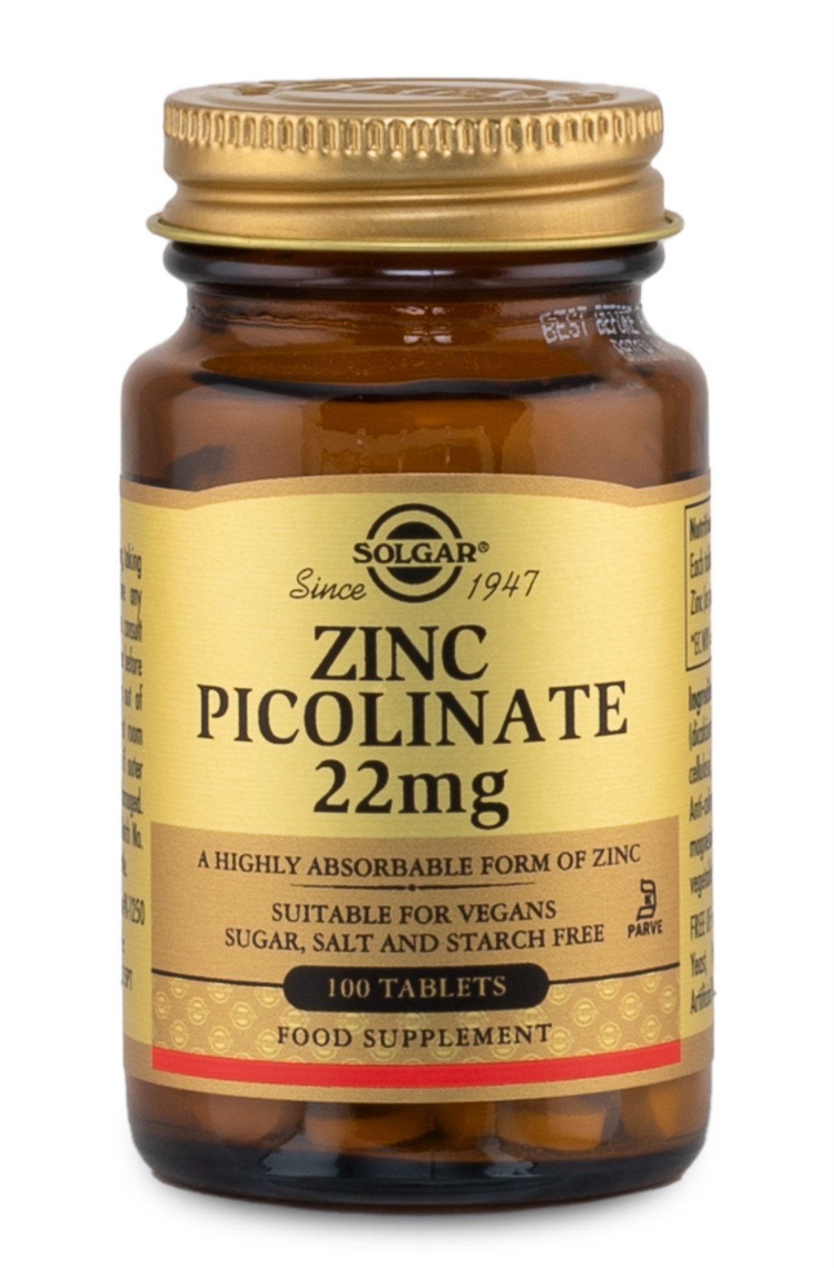 Solgar Zinc Picolinate innehåller zinkpikolinat med 22 mg per tablett. Mineralet zink fungerar som en antioxidant som skyddar kroppens celler mot oxidativ stress, samt deltar i hormonregleringen. Zinkpikolinat är en kelaterad form av zink, där mineralet är bundet till aminosyran pikolinsyra, för bästa upptagningsförmåga i kroppen. Använd Solgar Zink Picolinate som ett dagligt tillskott för att säkerställa intaget av detta mineral.