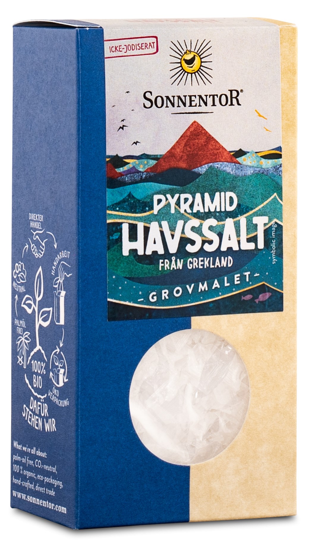 Havssalt Pyramid från Sonnentor är ett ekologiskt salt av högsta kvalitet. Saltets speciella form skapas av långsamt avdunstande saltlösning där kristaller bildas i processen. Pyramidsalt löser sig snabbt och passar perfekt till att salta efter tillagning, på sallader, grytor och andra maträtter.