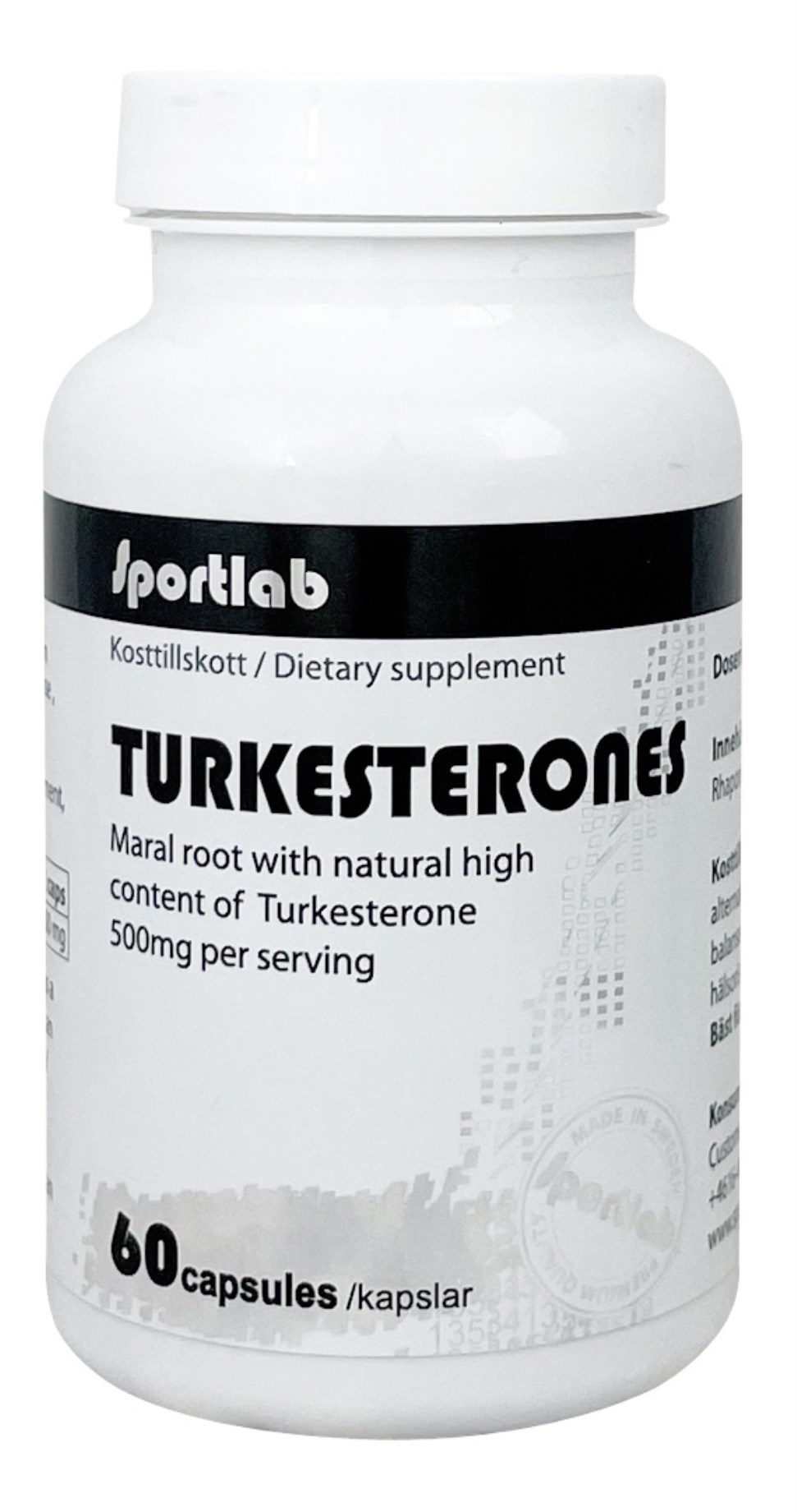 Sportlab Turkesterones innehåller turkesteron, en ecdysteroid som finns naturligt i växten Maralrot och som påminner om hormonet testosteron. Den avgörande skillnaden är att ecdysteroider inte binder sig till androgena receptorer och kan därför inte orsaka de biverkningar som testosteron ger. Turkesteron är den mest omtalade typ av ecdysteroid man känner till idag. Turkesteron ökar proteinsyntesen och stödjer muskelcellernas upptag av aminosyran L-leucin – något som ger ökade förutsättningar för muskeluppbyggnad. Rekommenderad dosering av turkesteron är 500 milligram per dag. Du kan även inta turkesteron i cykler om åtta till tolv veckor.