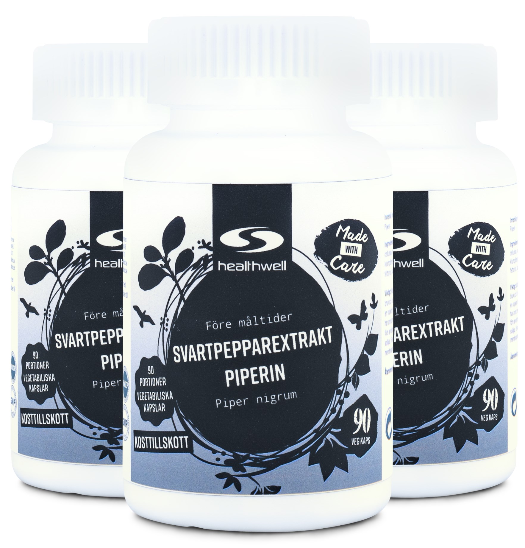 Piperin är det aktiva ämnet i svartpeppar (Piper nigrum) och det som ger peppar sin karaktäristiska starka och brännande smak. Piperin har intressanta egenskaper och har studerats för sin påverkan på näringsupptaget av vissa ämnen, där det visat sig kunna effektivisera mängden (1). Bland annat har piperin visat sig särskilt effektiv för att främja upptaget av kurkumin (gurkmeja), betakaroten samt vitaminer och mineraler. Piperinet är verksamt genom att det hämmar enzymer som bryter ned vissa näringsämnen, vilket medför att ämnet stannar längre i kroppen och på så sätt får en bättre biotillgänglighet. I motsats till vad man kanske skulle kunna tro, är svartpepparextrakt och piperin dessutom skonsamt mot magen.