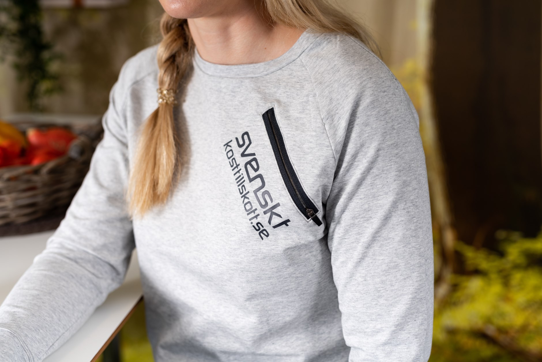 Årets skönaste tröja är här! Denna klassiska sweatshirt kommer i en underbart mjuk bomullsblandning som värmer skönt när vinden är kylig, samtidigt som en liten andel elastan gör tröjan precis lagom stretchig. Svenskt Kosttillskotts Sweatshirt till dam finns i två färger: en ljusgrå och en mörkgrå där bägge har ett melerat tyg. Framtill finns både ett mindre tryck samt en smidig liten ficka med blixtlås där du kan förvara exempelvis korthållare eller andra småsaker. Bak i nacken har vi satt en liten, diskret logga som visar att du är en del av vårt starka team.