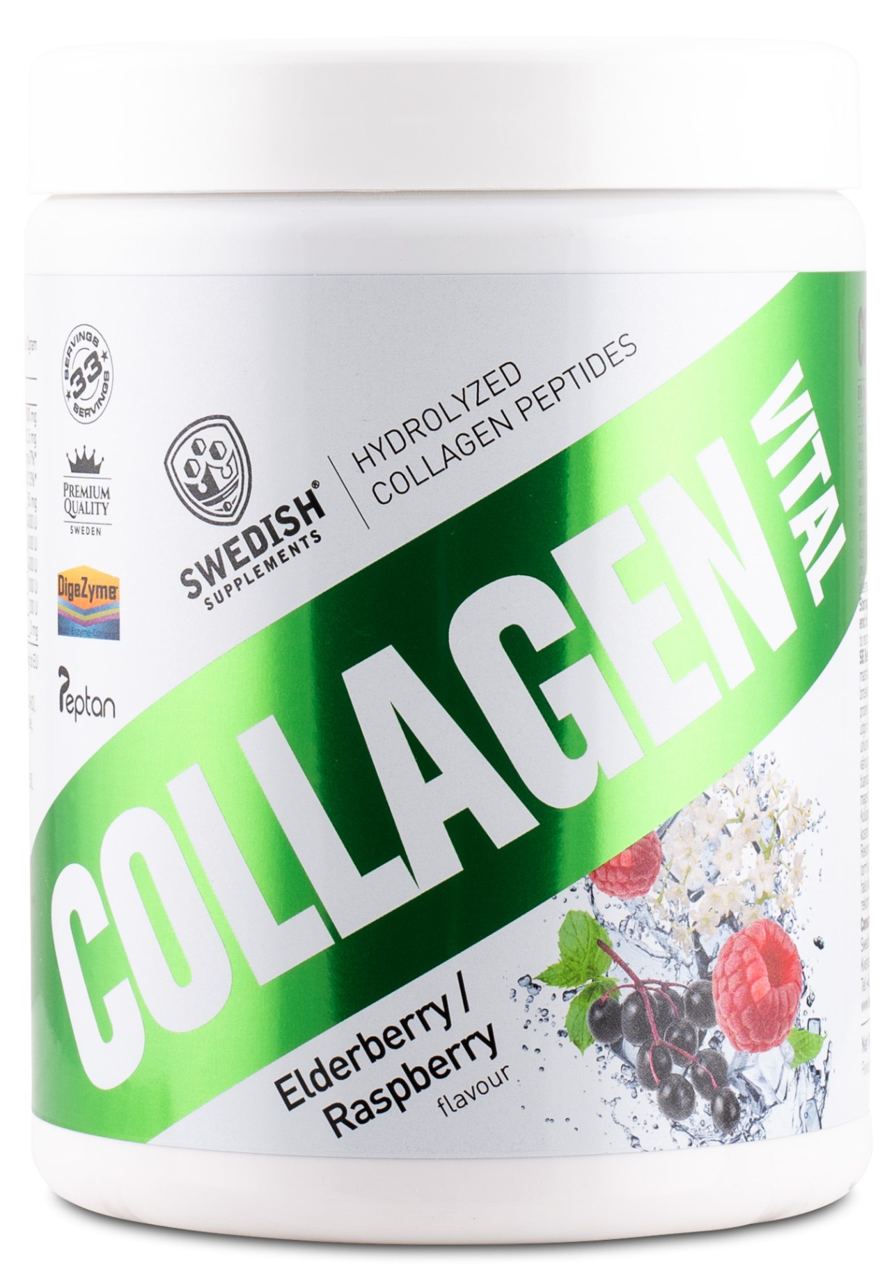 Collagen Vital från Swedish Supplements är ett välsmakande kollagentillskott. Collagen Vital innehåller den världsledande kollagenråvaran Peptan®, kollagenpeptider från hydrolyserat kollagen i pulverform, som utvinns från gräsbetande nötkreatur. Collagen Vital innehåller även DigeZyme®, ett matsmältningsenzym-komplex, samt magnesium och C-vitamin. Kollagen finns naturligt i kroppen i all bindvävsstruktur, såsom leder, brosk, hud, hår och naglar. Produktionen av kollagen minskar i takt med att vi åldras.