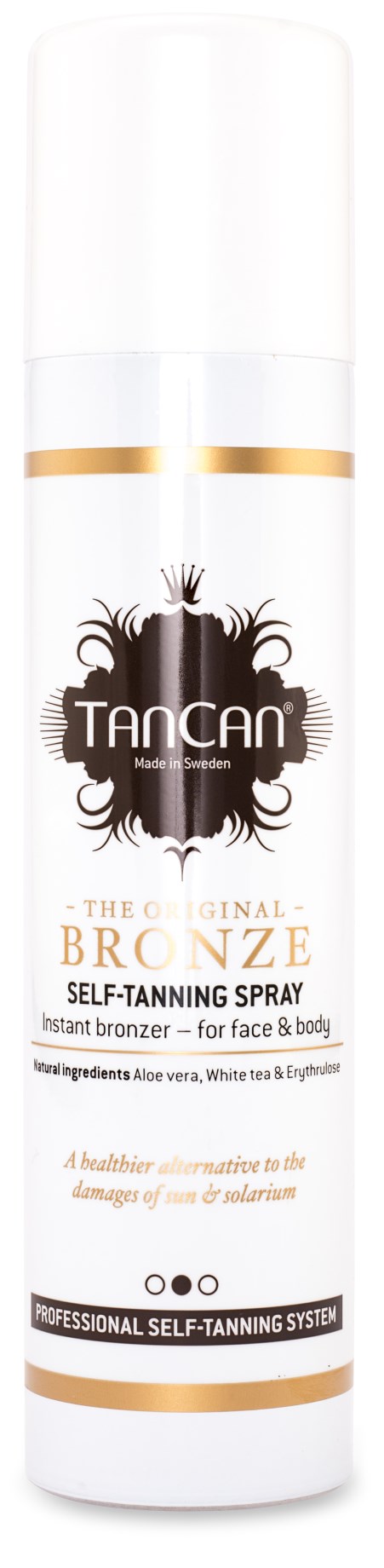 Med TANCAN BRONZE får du snabbt en djup solbränna utan ojämnheter. Sprayen innehåller bronzerfärg (färgguide) och ger direkt en jämn solbrun hud som efter verkningstiden blir djup och naturtrogen. Spraymisten lägger sig som ett tunt lager på huden och ger en äkta bränna som varar i cirka en vecka. Få en naturlig och vacker bränna utan de skadliga UV-strålarna med hjälp av TanCan!