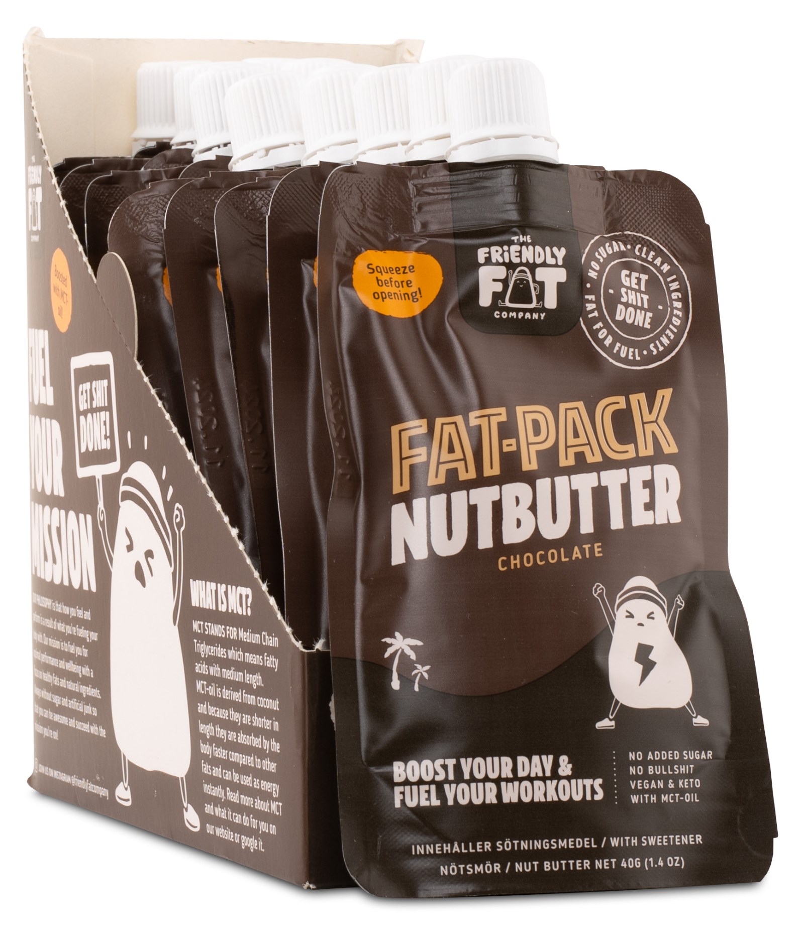 The Friendly Fat Company Fat-Pack Nutbutter är en riktig energiboost i smart förpackning som hjälper dig att höja energinivån innan träning och under eftermiddagsdippen. Nötsmöret har hela 23% protein och får en god smak av rostade jordnötter och mandlar. Mandel- och jordnötssmöret kommer i smidiga portionsförpackningar som är perfekta att ha med i väskan till jobbet eller gymmet när du vill maximera energinivån för att prestera på topp.