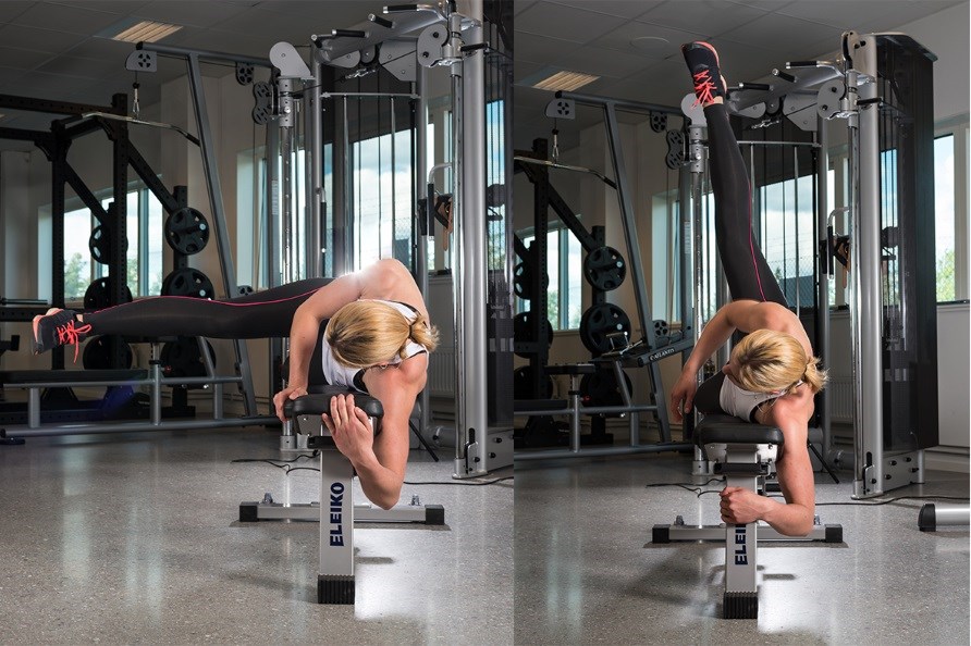 Utförande: Lägg dig på sidan, så bekvämt som du kan, på en bänk och ta ett fast grepp om bänken. För det översta benet ca 90 grader ut från kroppen, och höj den sedan rakt upp i luften. Låt därefter benet gå ner i startposition. Upprepa rörelsen 20 gånger, och lägg dig sedan på andra sidan för att träna båda sidorna. 3 set brukar vara lagom för vardera ben. Tänk på att hålla benet raklångt under hela övningen!