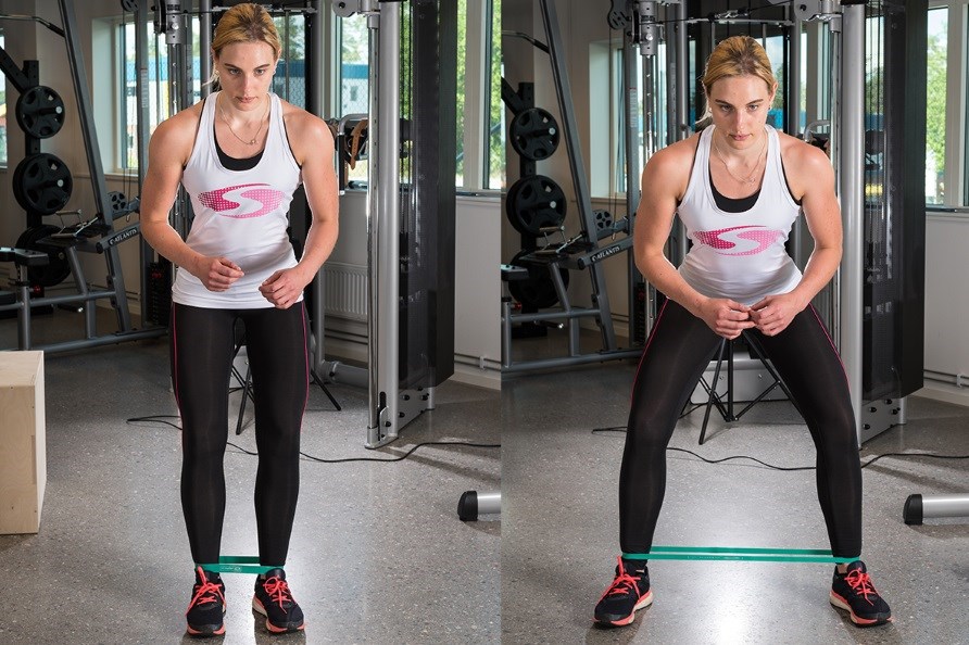 Utförande: Trä ett kort resistensband över dina fötter och låt det sitta strax över anklarna. Ta sedan så stora steg du kan åt sidan. Byt riktning när det börjar brännas ordentligt. Gör detta 2-3 gånger åt vardera håll.