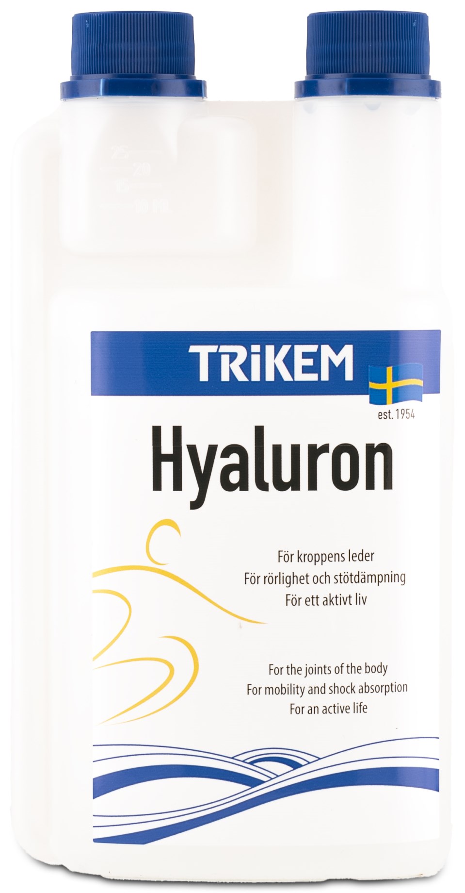 Trikem Human Hyaluron är en flytande lösning av hyaluronsyra för människor. Trikem Human Hyaluron passar utmärkt för dig som är aktiv eller som under lång tid har belastat dina leder, samt för äldre som vill upprätthålla god ledhälsa. Hyaluronsyra är en substans som kroppen själv producerar, men produktionen minskar succesivt med åldern. Hyaluronsyra finns bland annat i ledvätskan och är avgörande för att lederna ska fungera optimalt. Hyaluronsyra har en förmåga att binda vatten, vilket bidrar till ökad viskositet i ledvätskan. Detta resulterar i att lederna får bättre skydd mot stötar och bibehållen rörlighet. Trikem Human Hyaluron består av naturlig, högmolekylär hyaluronsyra och tillverkas i Sverige. Produkten är lätt att dosera och har en frisk citronsmak.