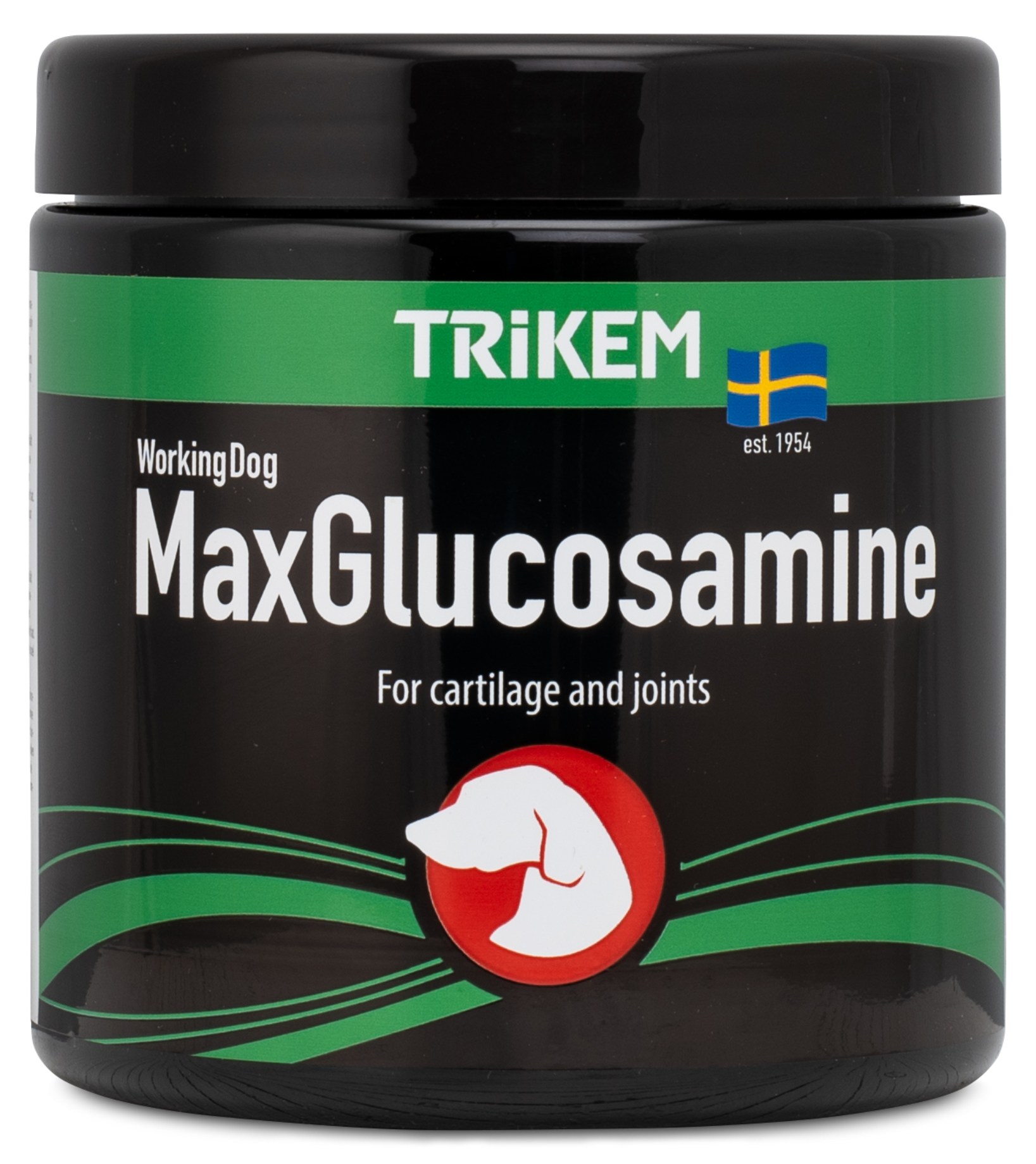 WorkingDog MaxGlucosamine från Trikem ger hundens leder och brosk rätt förutsättningar att fortsätta fungera normalt även när hunden börjar bli äldre. Det kroppsegna ämnet glukosamin finns naturligt i brosk, senor och ligament men ju äldre hunden blir, desto mer avtar kroppens egen förmåga att producera glukosamin. Då är MaxGlucosamin+ ett utmärkt tillskott för att motverka stelhet i lederna. Detta tillskott framställs av skaldjur och har en god smak samt är extra lätt för kroppen att ta upp.