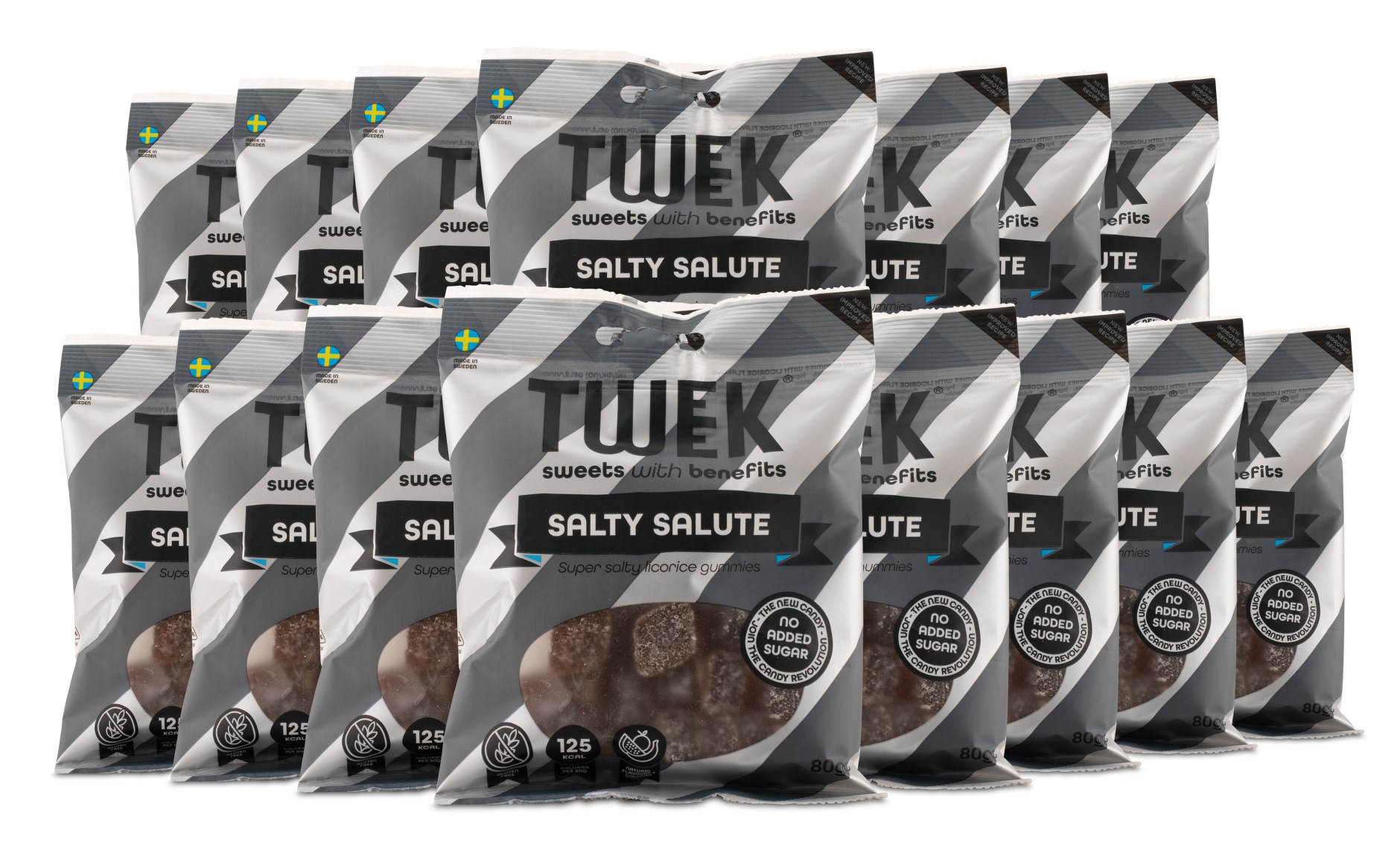 Tweek Salty Salute är för dig som älskar riktigt salta godisar. Salty Salute är gjort på äkta lakrits och innehåller 95 % mindre socker, färre kalorier och har ett högre fiberinnehåll än vanligt godis. Ett hälsosammare val när godissuget slår till!