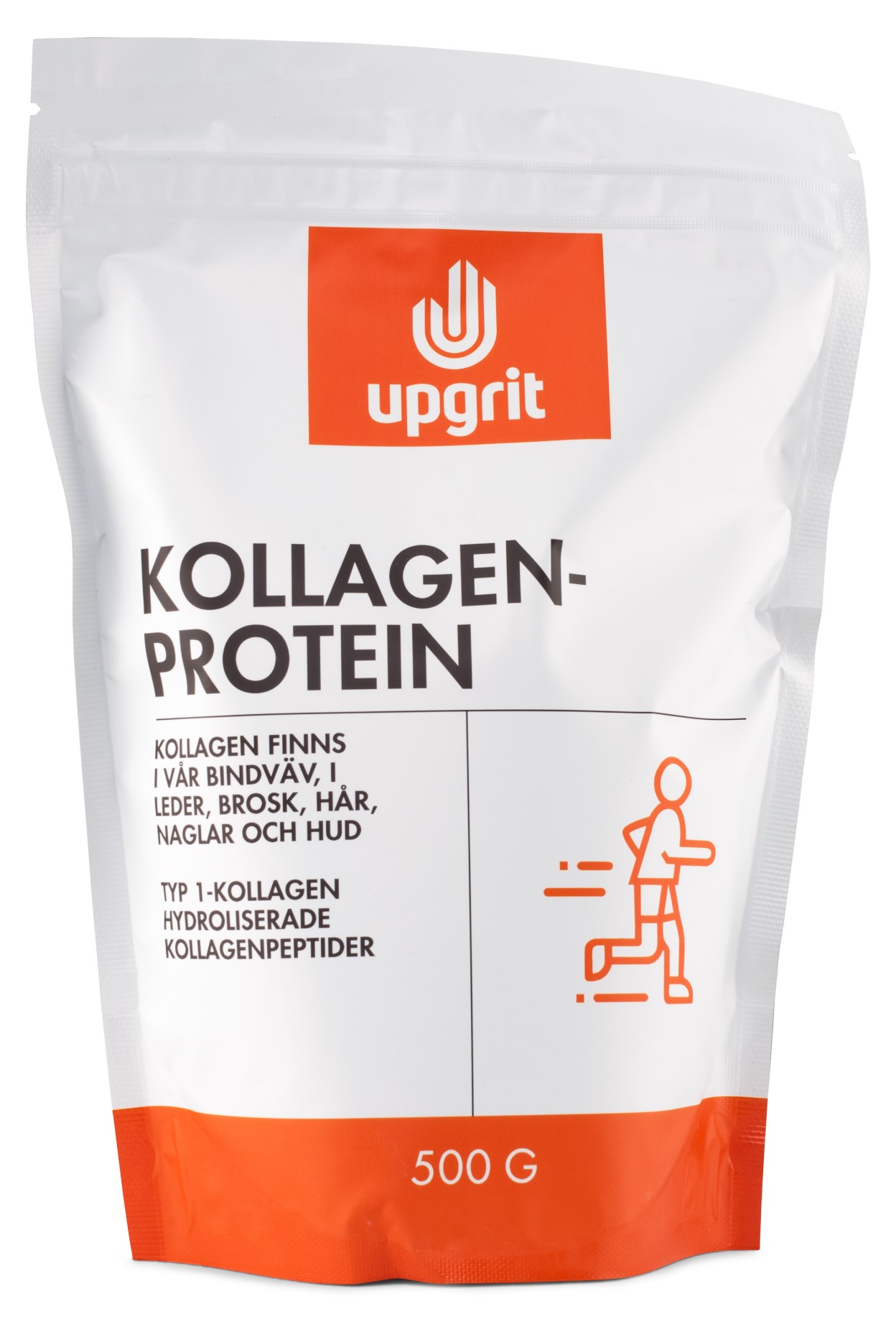 Upgrit Kollagenprotein är ett rent kollagenprotein från gräsbetande kor. Proteinet är rikt på glycin, prolin och hydroxiprolin, tre aminosyror som vår kropp använder för att tillverka sitt eget kollagen. Kollagen finns i leder och ledbrosk, hud, hår och naglar men vår kroppsegna produktion minskar med åldern. Kollagenproteinet från Upgrit är av högsta kvalitet och kommer från gräsbetande kor. Proteinet har en neutral smak och är därför perfekt att blanda i smoothies, kaffe, bakning eller soppor. Det blandar sig enkelt i både kall och varm dryck.