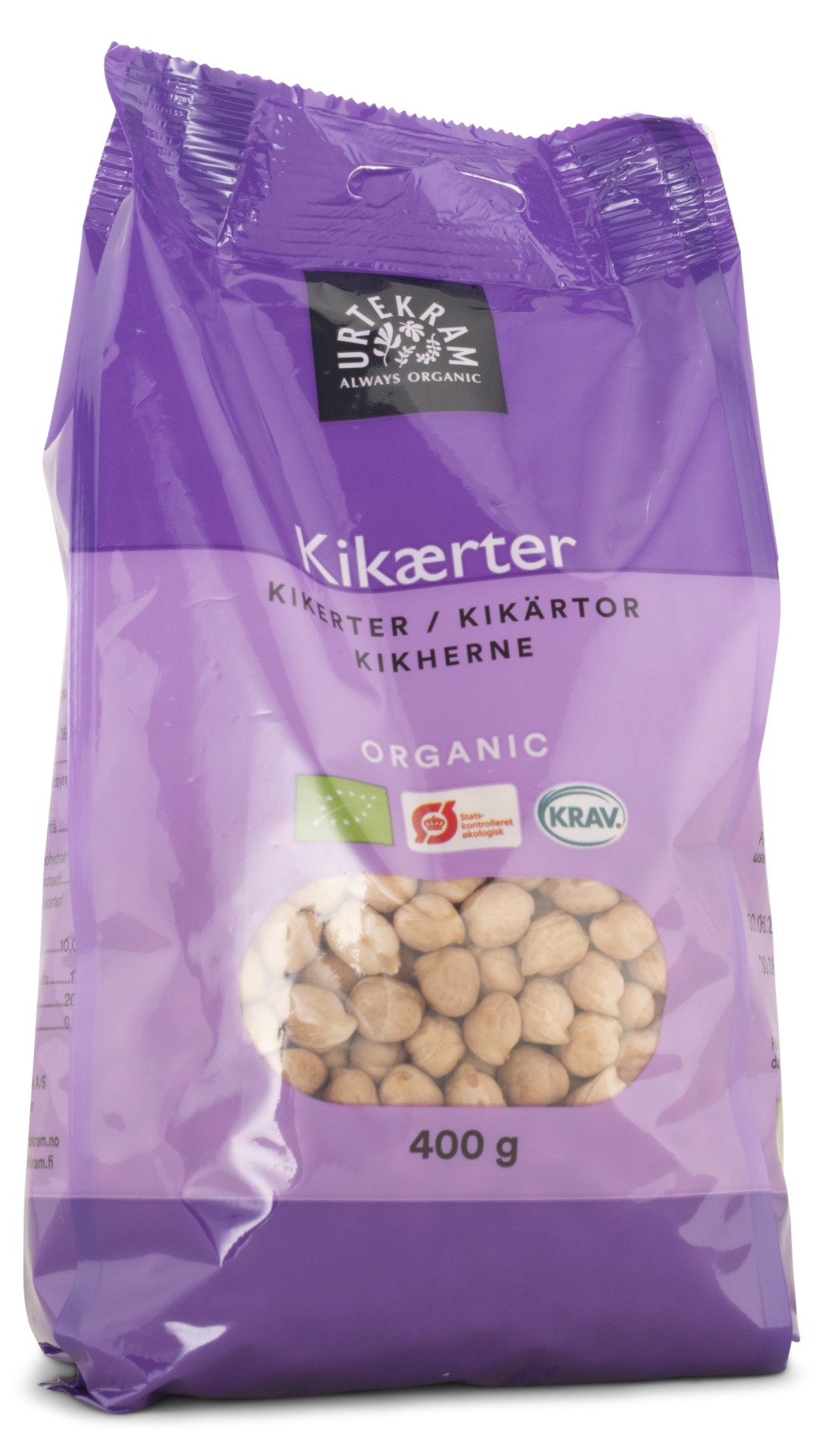 Urtekram Kikärtor Eko i påse har ett fiberrikt innehåll och en mild, nötaktig smak. Kikärtor är framförallt en klassiker i hummus och andra röror, men de passar även bra i sallader och i sammankokta rätter tack vare att den fasta formen bevaras. Prova gärna att blanda kikärtor med kryddor och grilla dem ett par minuter för att få en yta, eller mixa de kokta kikärtorna och gör vegetariska biffar av dem. När det gäller Urtekram Kikärtor Eko Påse så är det bara din fantasi som sätter gränsen.