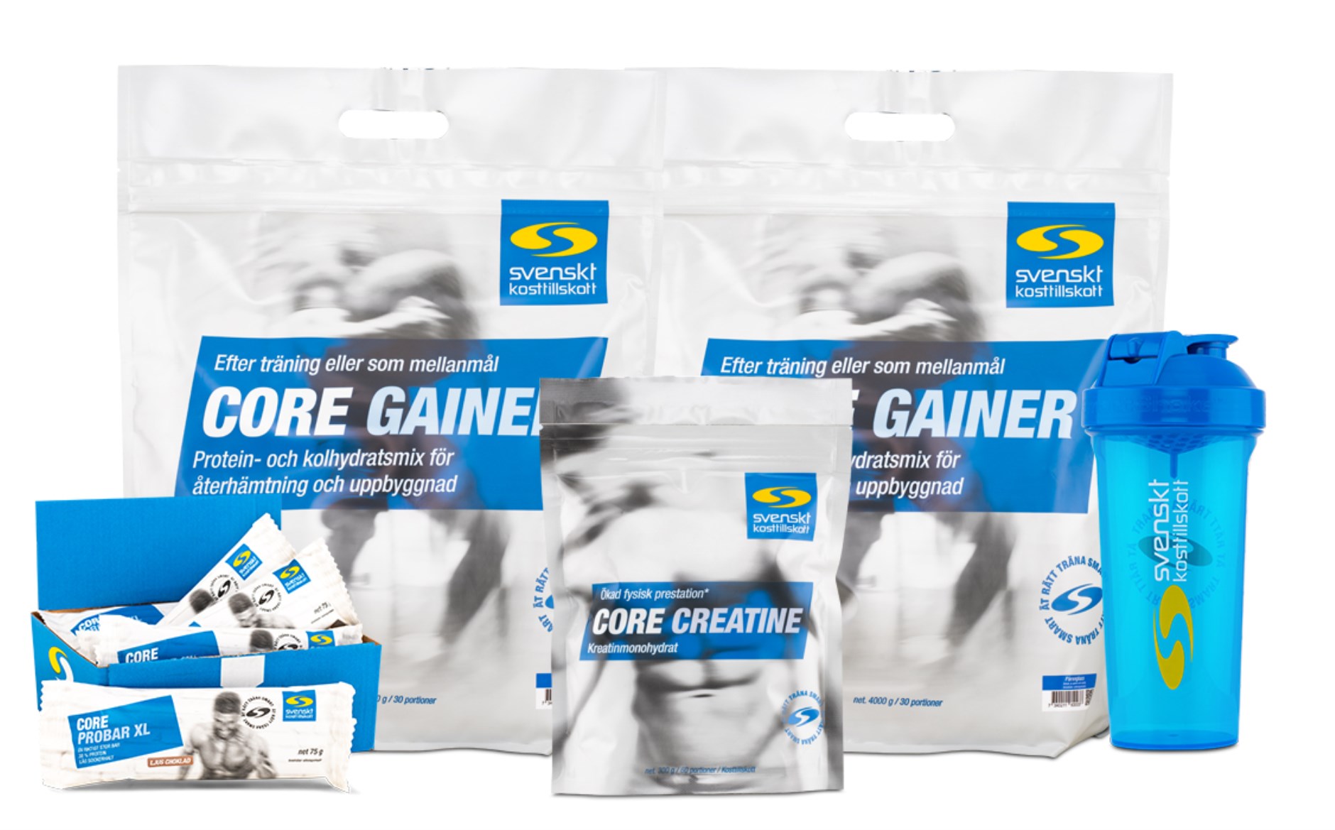 - Core Gainer är energität med 28 g protein och 95 g kolhydrater per portion, smidigt och gott. Ta en portion som mellanmål två gånger per dag. Träningsdagar tar du en av portionerna efter träning.