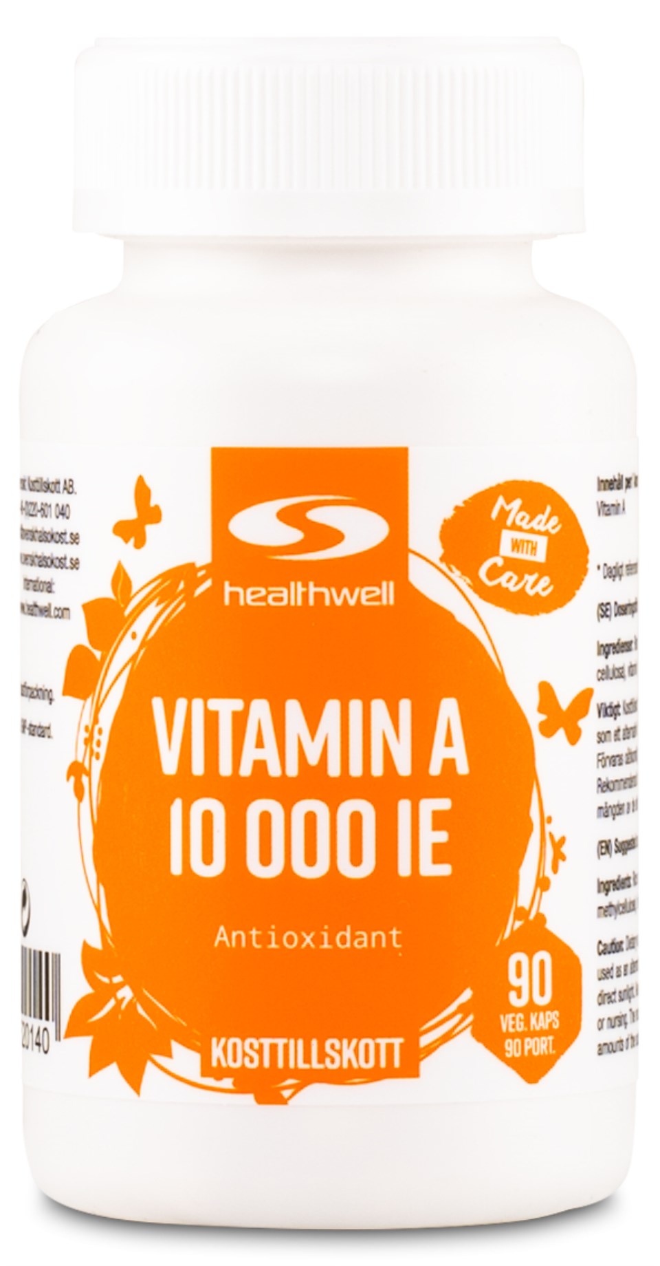 Healthwell Vitamin A 10 000 IE innehåller retinylpalmitat, en form av A-vitamin som kroppen kan använda direkt utan omvandling. Detta preformerade vitamin A är av vegetabiliskt ursprung och skonsamt för magen och tarmen, vilket gör det lämpligt för känsliga magar. Produkten är dessutom berikad med MCT-olja från kokos för att förbättra upptaget, eftersom A-vitamin är fettlösligt och kräver en liten mängd fett för effektiv absorption. MCT-olja består av medellånga fettsyror från kokosolja.
