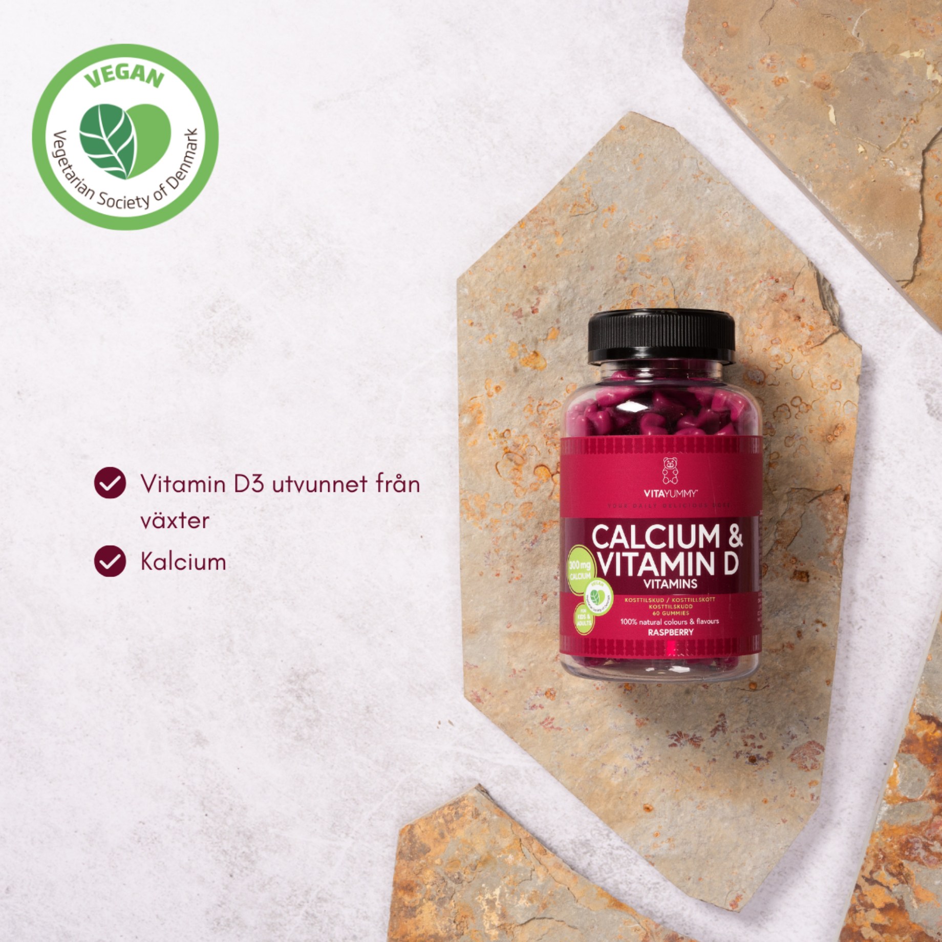 VitaYummy Calcium & Vitamin D är gummies i hallonsmak med kalcium och vitamin D. Kalcium bidrar till normal benstomme och normala tänder, samt till normal muskelfunktion. Vitamin D bidrar till normalt upptag av kalcium i kroppen. Dessa gummies passar både vuxna och barn, och särskilt de som inte får i sig tillräckligt genom kosten eller inte dricker mjölk. Veganskt och fritt från konstgjorda färger, smaker och sötningsmedel.