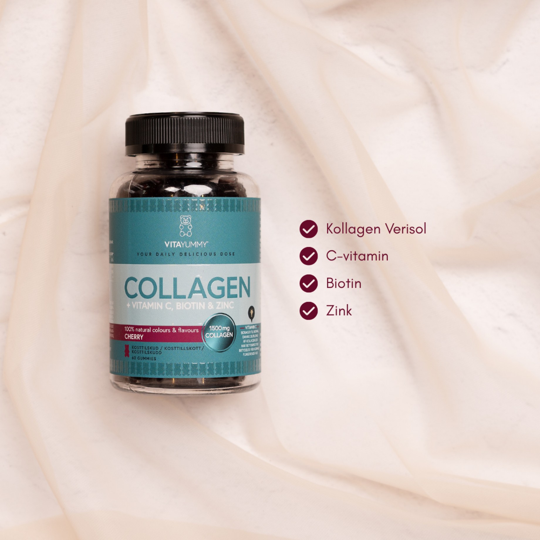 VitaYummy Collagen gör det smidigt att komplettera med kollagen i vardagen i form av välsmakande gummies. Varje dagsdos ger 1500 mg hydrolyserat kollagen från Verisol®, kombinerat med vitamin C som bidrar till normal kollagenbildning samt biotin och zink som bidrar till att bibehålla normal hud.