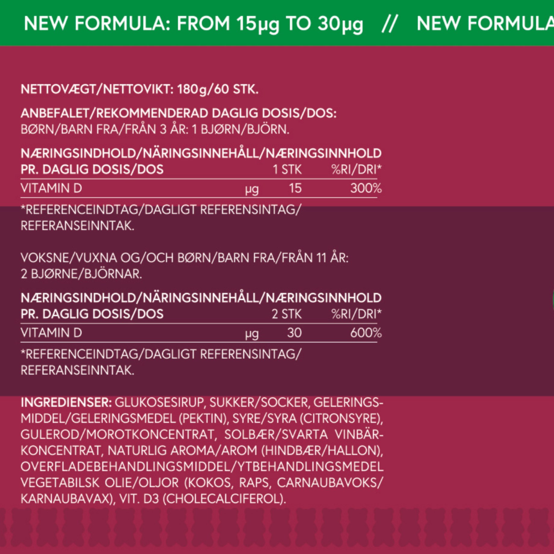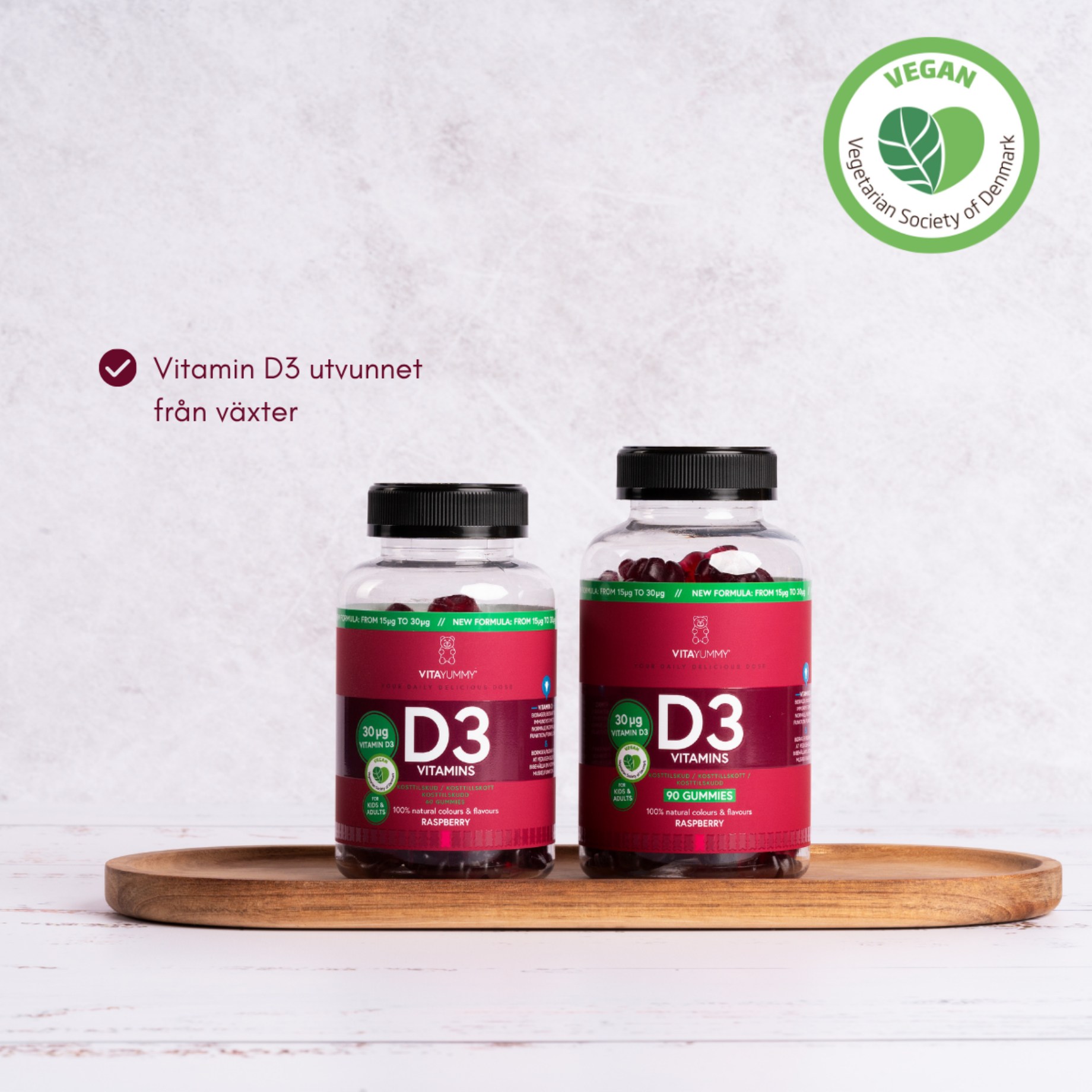 VitaYummy D3 är växtbaserade gummies med vitamin D3 som kan tas av både vuxna och barn från 3 år. Varje gummy ger 15 mcg vitamin D3. För vuxna motsvarar två stycken 30 mcg per dag, medan en räcker för små barn. Den goda smaken kommer från hallon, och även färgen är naturligt extraherad, från morot och svarta vinbär. Dessutom är VitaYummy D3 veganska och utan artificiella färgämnen, smakämnen eller sötningsmedel.