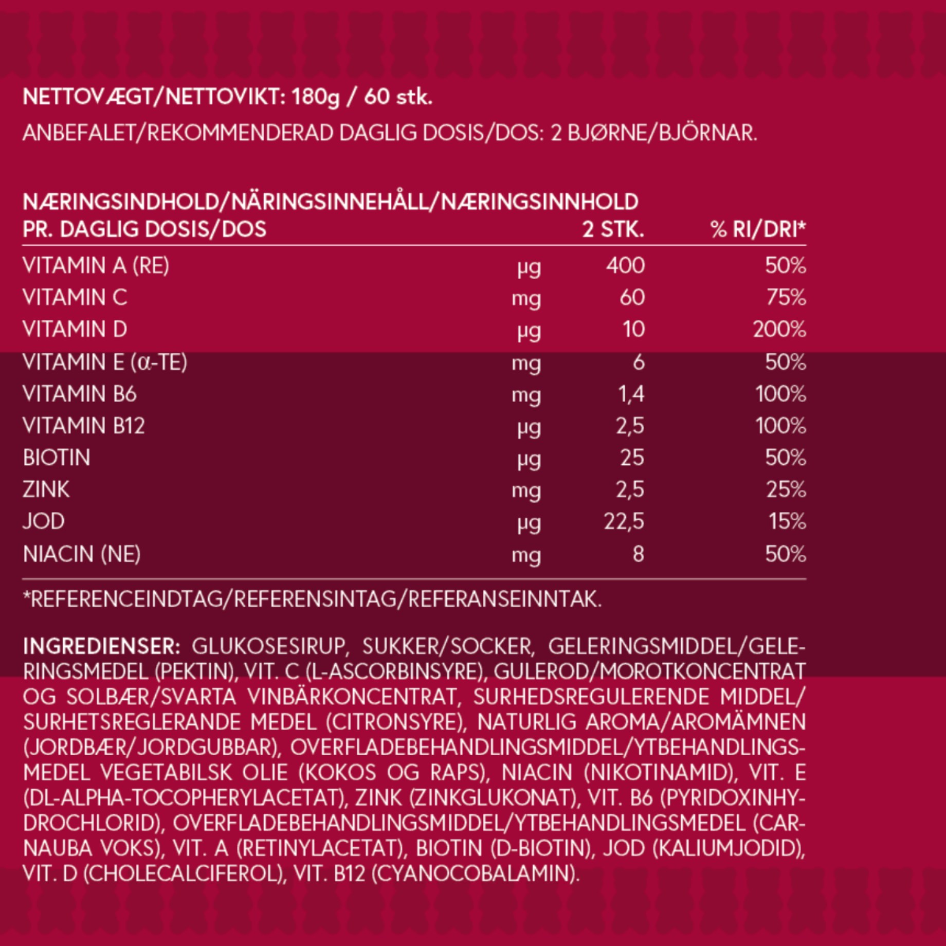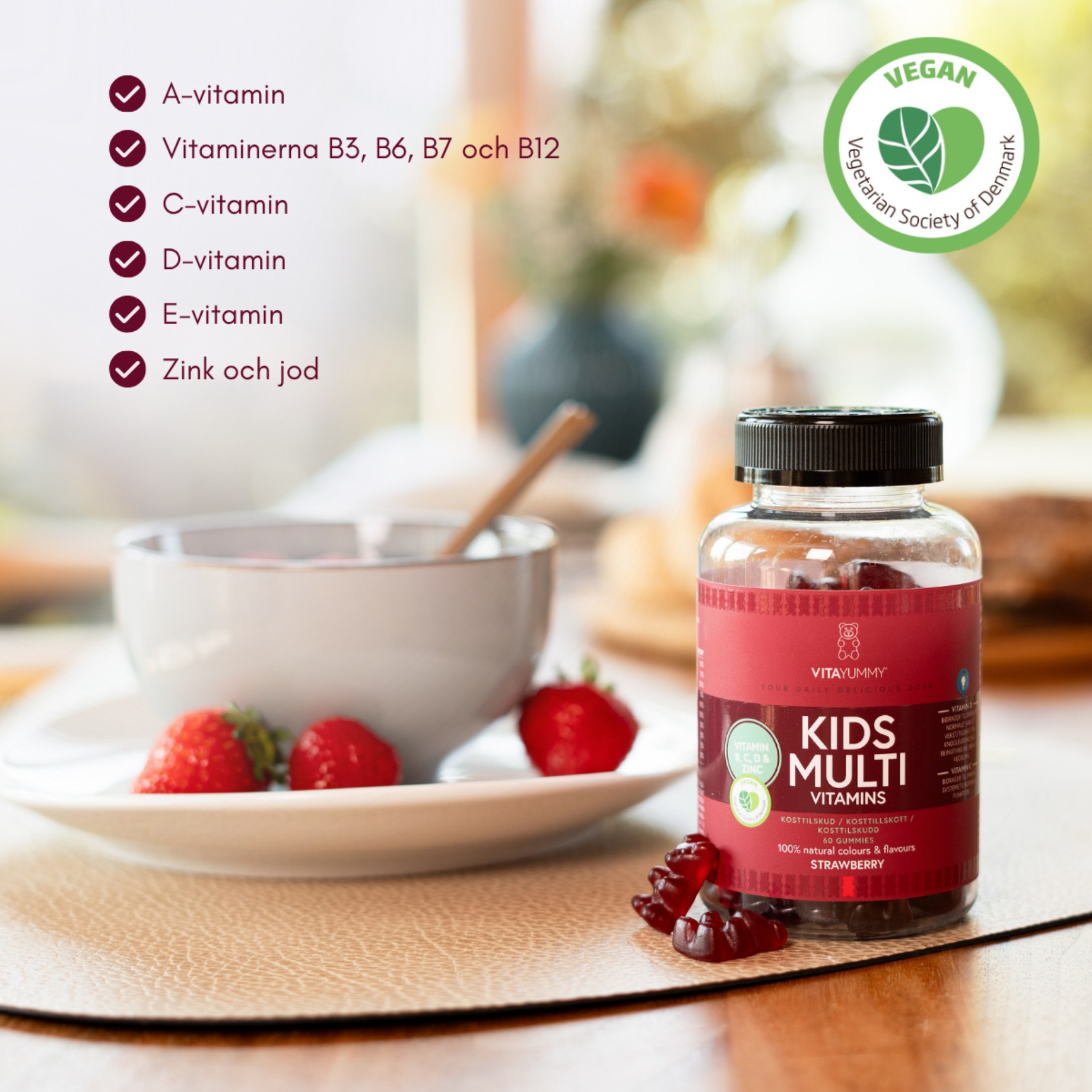 Gör det lätt att fylla på ditt barns vitaminintag med VitaYummy Kids Multi – goda gummies i form av björnar, fulla med vitaminer och mineraler. Gummiesarna innehåller vitamin A, flera B-vitaminer, vitamin C och vitamin D samt mineralerna zink och jod. Smaken kommer från naturlig arom från jordgubbar och färgen från frukt- och grönsakskoncentrat. Två björnar om dagen räcker för att säkra intaget!