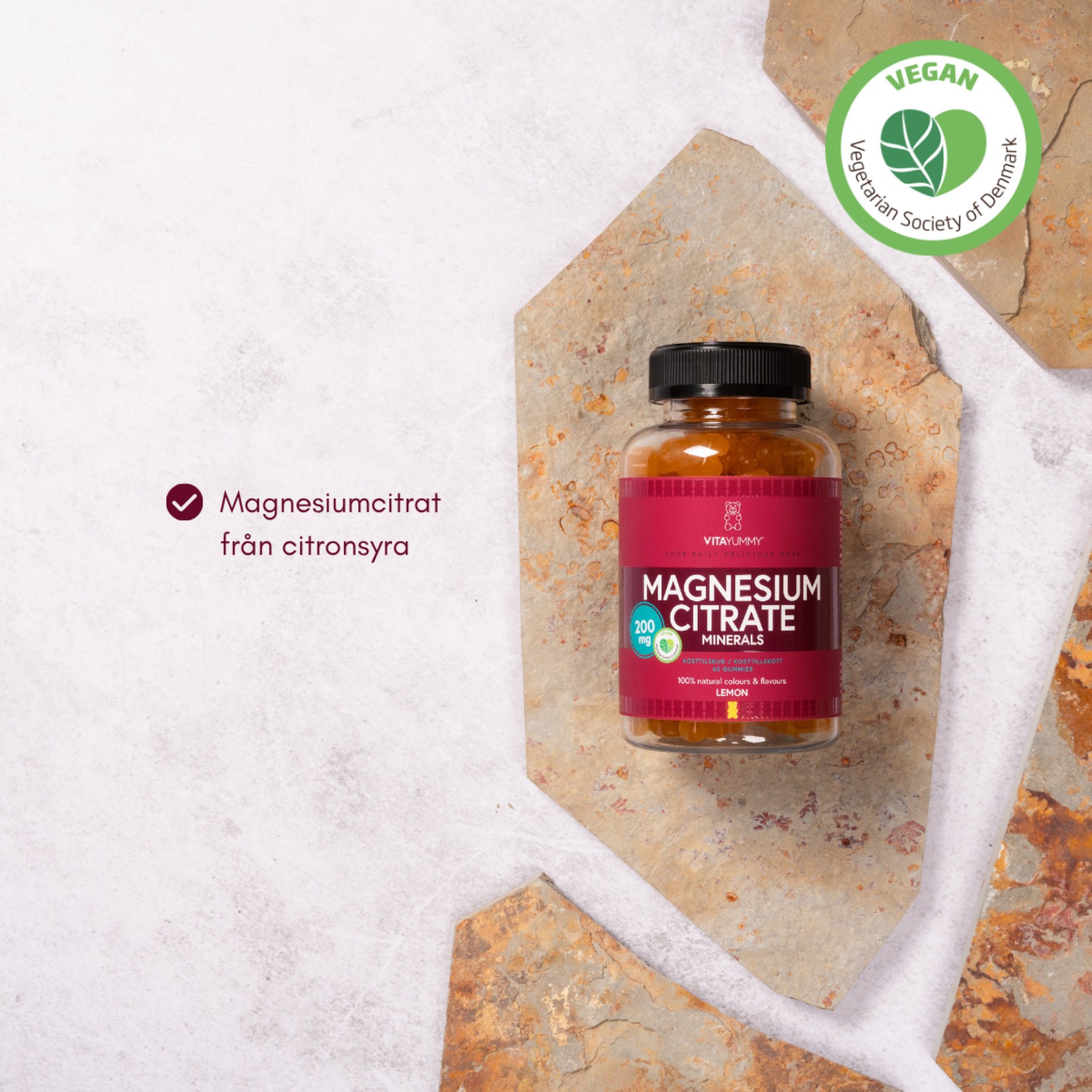 VitaYummy Magnesium Citrate innehåller 200 mg magnesiumcitrat per portion med god smak av citron eller jordgubb. Tillskottet innehåller inga konstgjorda färger, smaker eller sötningsmedel. Magnesium är ett vitalt mineral involverat i flera viktiga funktioner i kroppen. Bland annat bidrar det till normal psykologisk funktion, normal muskelfunktion och proteinsyntes. Magnesium främjar även minskad trötthet och utmattning. Perfekt för dig som tränar!