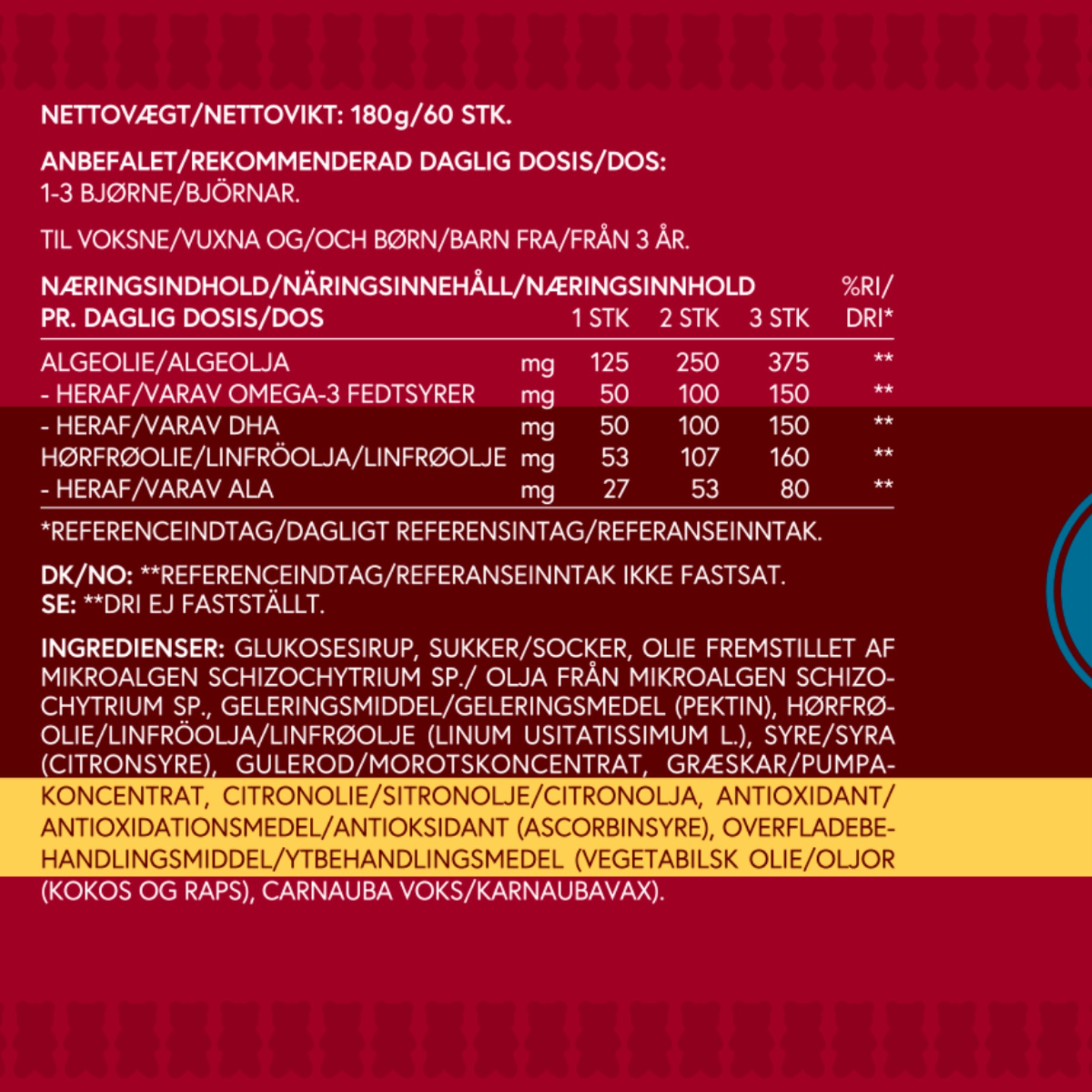 VitaYummy Omega 3 är ett smidigt omega-3-tillskott i form av goda gummies. Innehåller DHA och ALA och är 100 % veganskt, där fettsyrorna kommer från alger och linfrön – ett växtbaserat alternativ till fiskolja. DHA bidrar till normal hjärnfunktion och syn, medan ALA är en naturligt förekommande fettsyra i kroppen. Perfekt för dig som vill ha ett lättupptagligt omega-3-tillskott utan fisk. Fri från artificiella färger och smaker. Naturlig färg från morot och pumpa.