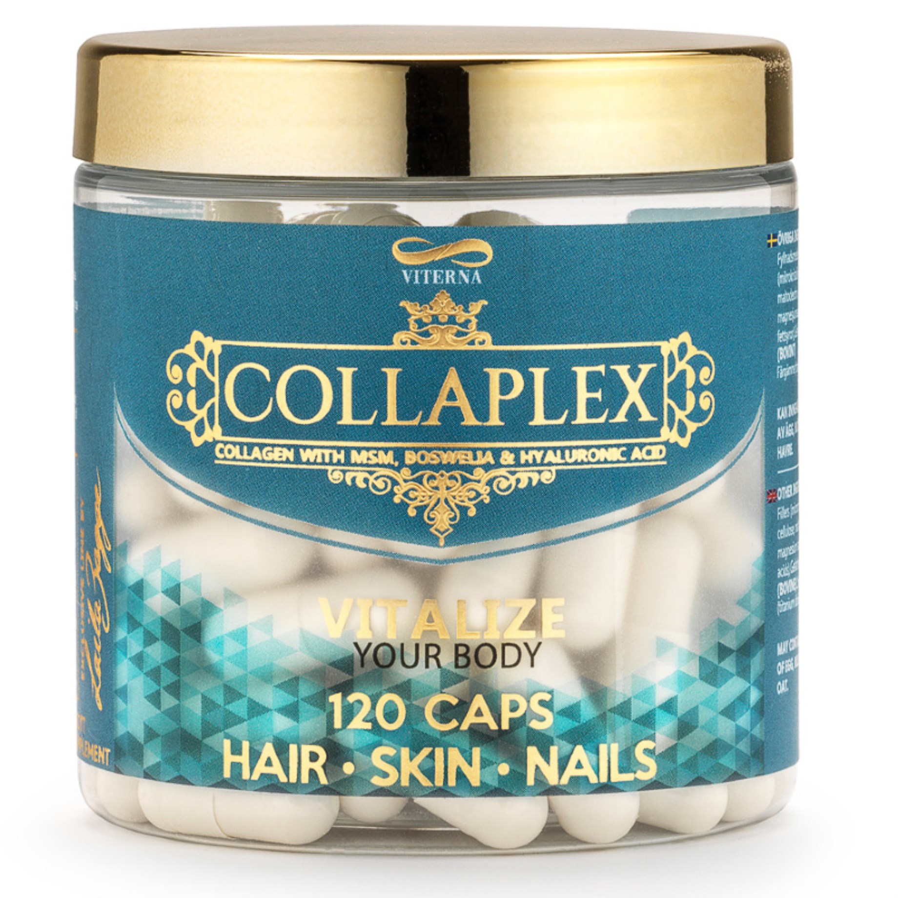 Viterna By Laila Bagge Collaplex är en komplett produkt för hår, hud och naglar. Den består av 100 % av hydrolyserat kollagen kombinerad med 9 utvalda ingredienser som hjälper återuppbyggandet av kroppens struktur inifrån. Bland annat zink, c-vitamin, B5, hyaluronsyra och boswellia. För vackert hår, hud och naglar!