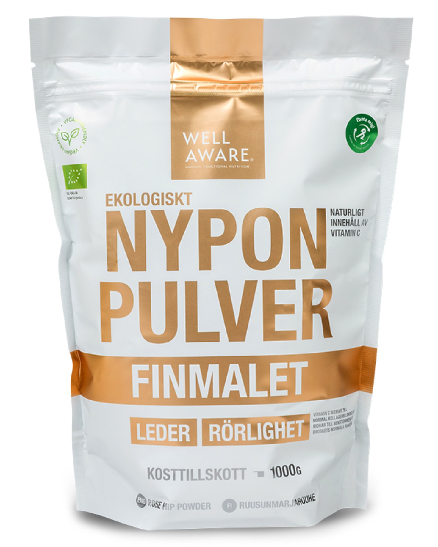 WellAware Nyponpulver är ett ekologiskt och välsmakande pulver av ugnstorkade, finmalda strandnypon (Rosa canina L). Ugnstorkning ger full kontroll över torkprocessen och är en fördel för att bevara C-vitamininnehållet. Pulvret är fullt av vitaminer, mineraler och antioxidanter och innehåller, utöver C-vitamin, bland annat E-vitamin, mangan och fosfor. Tack vare dess goda smak kan du enkelt blanda pulvret i en smoothie eller strö det över gröten.