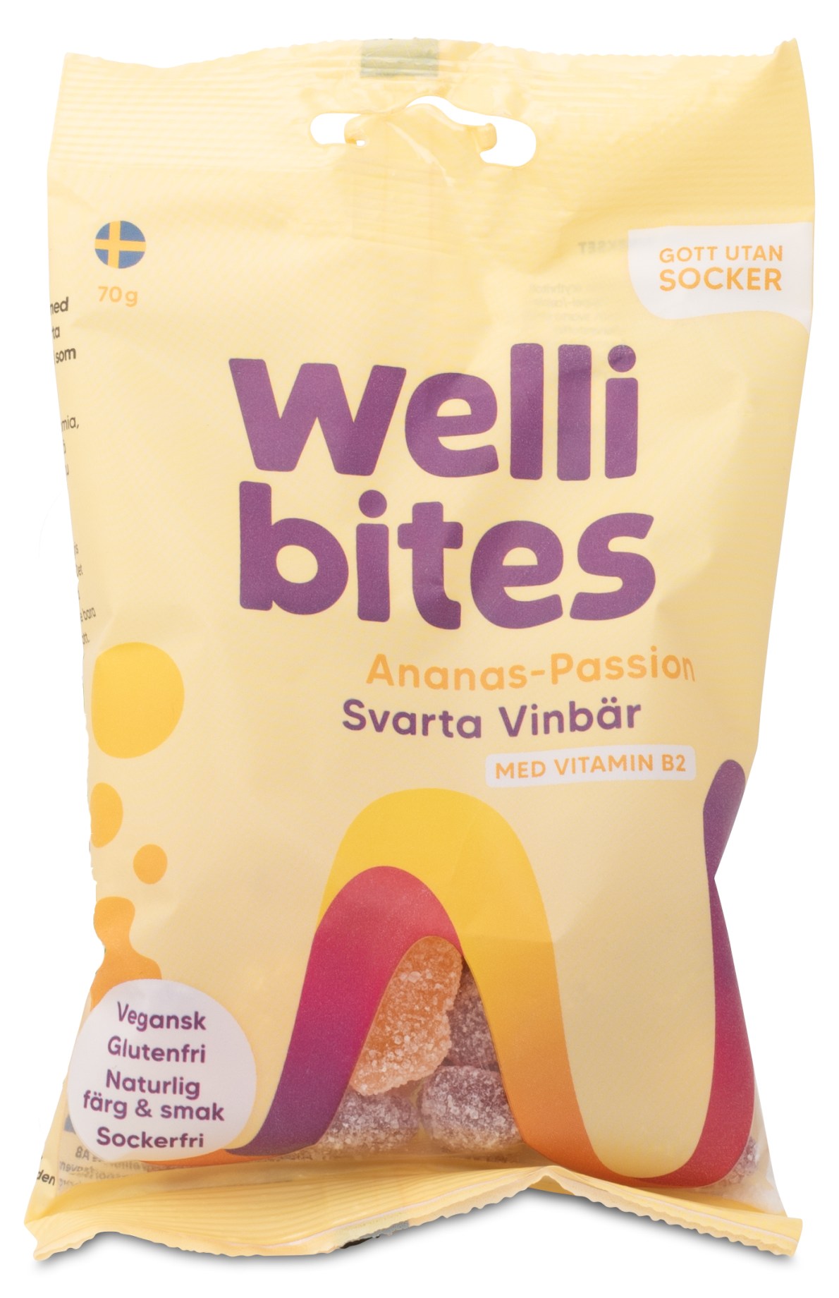 Wellibites Ananas-Passion & Svarta Vinbär är ett gelégodis som är sockerfritt och veganskt. Smak och färg är naturligt från frukt och grönt. Oemotståndligt gott och smakrikt samt med 40 % färre kalorier än vanligt godis. Smaken ananas-passion och svarta vinbär smakar tropiskt och fräscht och är dessutom berikat med vitamin B2. Fritt från gluten och palmolja. Njut av hälsosamt och gott godis!