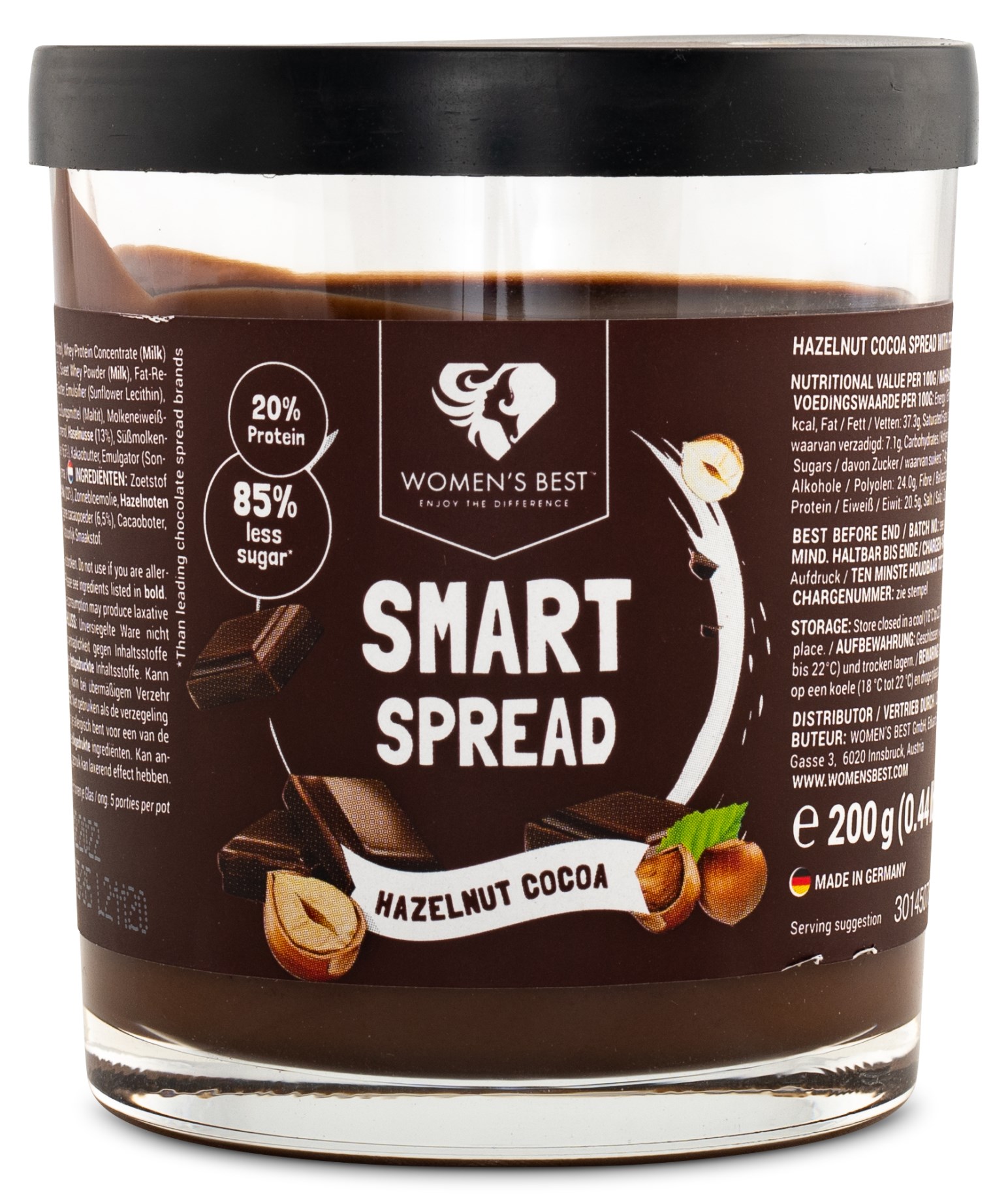 Womens Best Smart Protein Spread är en härligt len och god chokladkräm med smak av rostade hasselnötter, fylld med protein. God att ha som topping på pannkakor, våfflor eller på en toast, den är även perfekt att baka med. Njut av den mjuka konsistensen och härliga smaken.